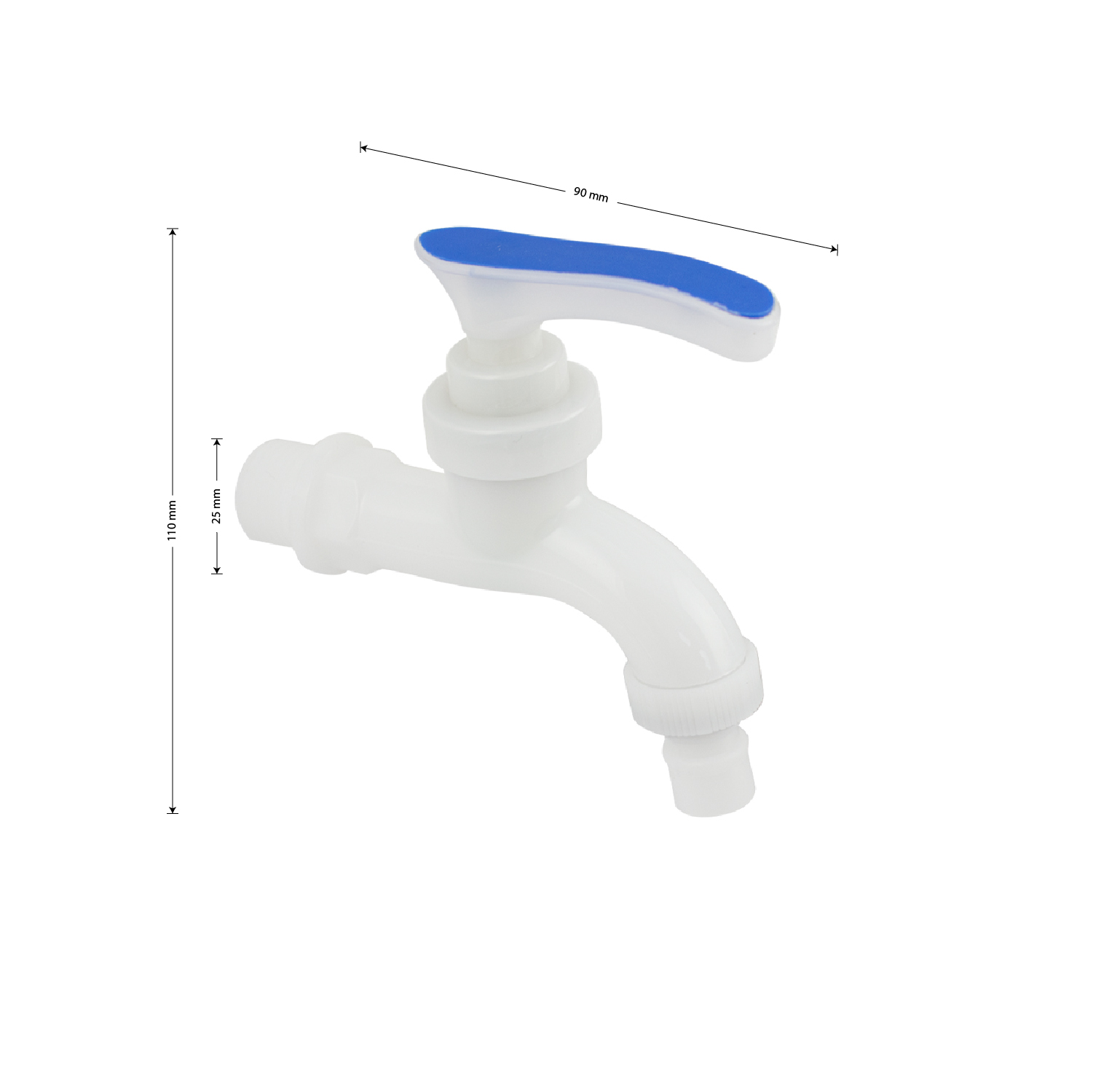 Кран водоразборный 1/2, из высокопрочного пластика АБС белый со штуцером, с возможностью подсоединения поливочного шланга. Верхняя часть ручки синего цвета. Габаритные размеры: высота 110 мм, 90 мм от стены, диаметр посадочного седла 25 мм. Металлокерамика, синяя ручка - флажок. Вес - 0,05 кг, объём - 0,0003 м3
