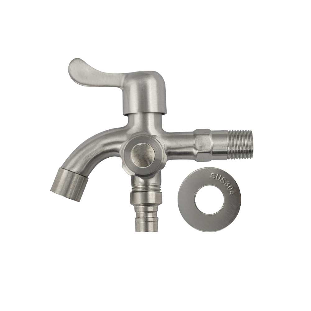 Кран водоразборный на 1/2", наружняя резьба, из нержавеющей стали марки SUS 304, с двойным выходом, металлокерамика, ручка флажок поворот на 90˚. Такая модель может использоваться на домашней кухне, на даче, в медицинских учреждениях и общественных местах. Габаритные размеры: высота 115 мм, длина 120 мм, диаметр посадочного седла 45 мм. Вес - 0,45 кг, объём - 0,00128 м3.