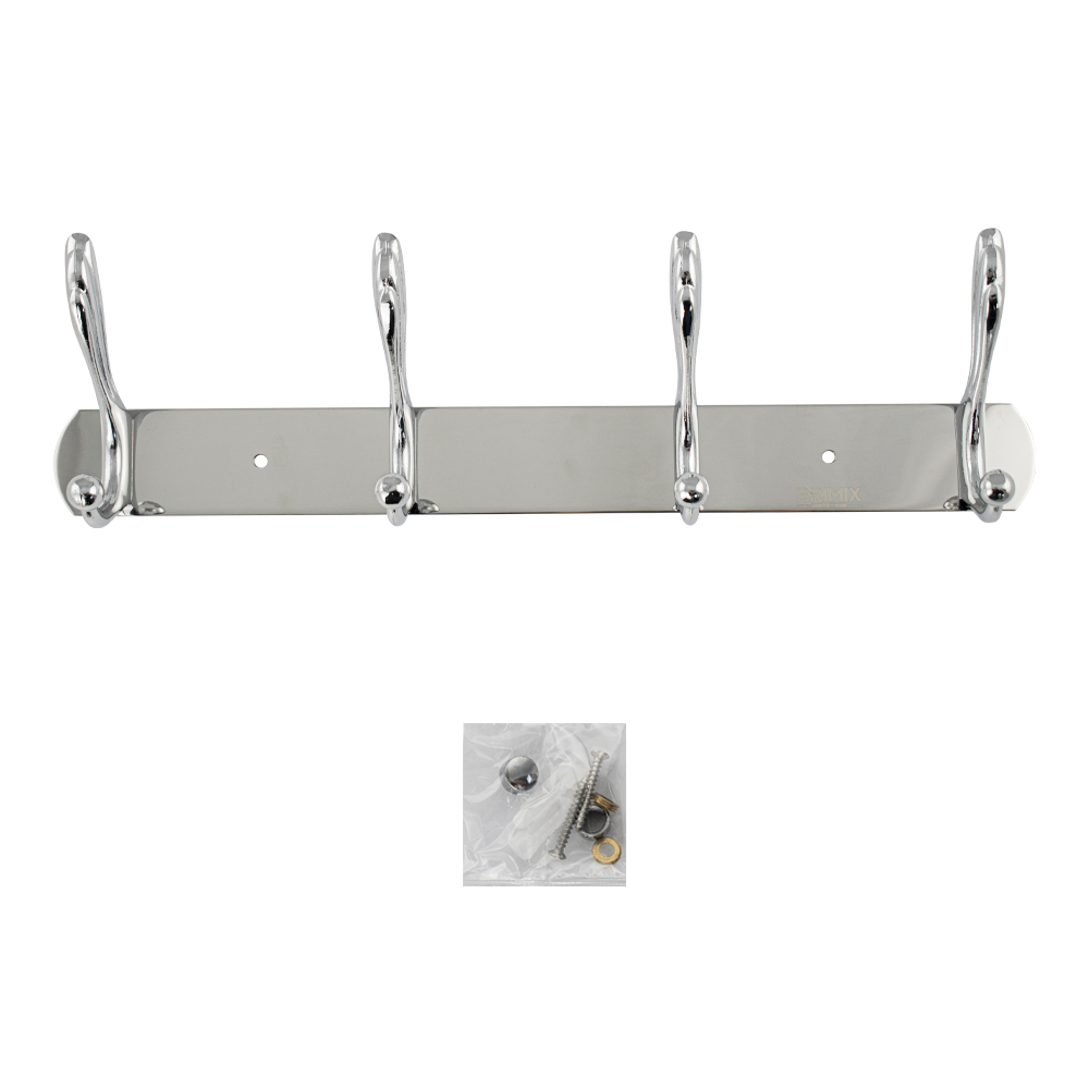 Вешалка - держатель для принадлежностей, металлический, хромированный, с четырьмя двойными крючками. Изготовлен из прочной нержавеющей стали марки SUS 304 с хромированным покрытием, которое придает безупречный стильный вид и долговечность. Хромированное покрытие очень стойко переносит истирания и обеспечивает зеркальный блеск изделия. На держателе с легкостью можно размещать вещи для сушки или вешать, как полотенца, так и одежду перед походом в душ. Идеально подойдет не только для ванной, но и для кухни, а также для дачи или гаража - при необходимости на держатель можно вешать любые предметы. Изделие крепится к стене с помощью дюбелей и саморезов (входят в комплект). Габаритные размеры: длина 345 мм, высота 95 мм, глубина 55 мм. Вес - 0,400 кг, объём - 0,00133 м3.