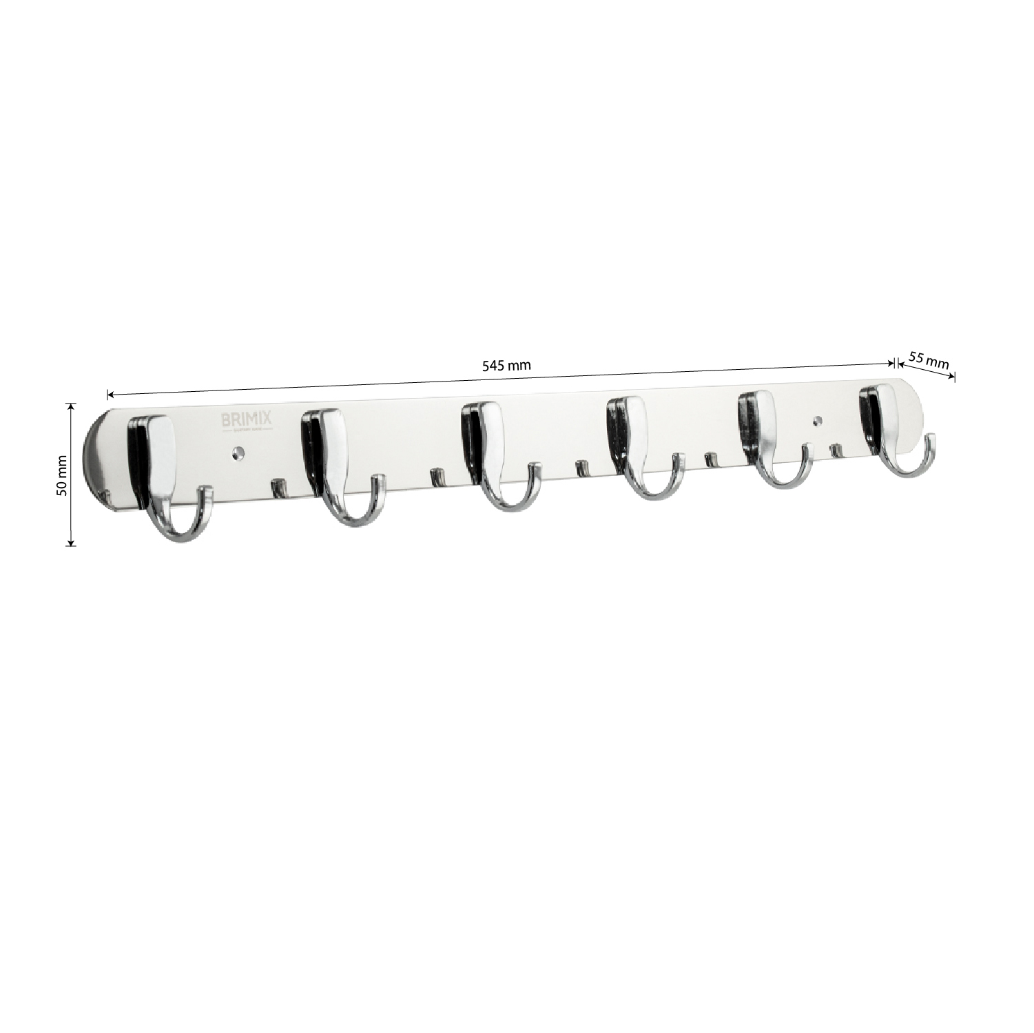 Вешалка - держатель для принадлежностей, металлический, хромированный, с шестью крючками. Изготовлен из прочной нержавеющей стали марки SUS 304 с хромированным покрытием, которое придает безупречный стильный вид и долговечность. Хромированное покрытие очень стойко переносит истирания и обеспечивает зеркальный блеск изделия. На держателе с легкостью можно размещать вещи для сушки или вешать, как полотенца, так и одежду перед походом в душ. Идеально подойдет не только для ванной, но и для кухни, а также для дачи или гаража - при необходимости на держатель можно вешать любые предметы. Изделие крепится к стене с помощью дюбелей и саморезов (входят в комплект). Габаритные размеры: длина 545 мм, высота 50 мм, глубина 55 мм. Вес - 0,400 кг, объём - 0,00150 м3