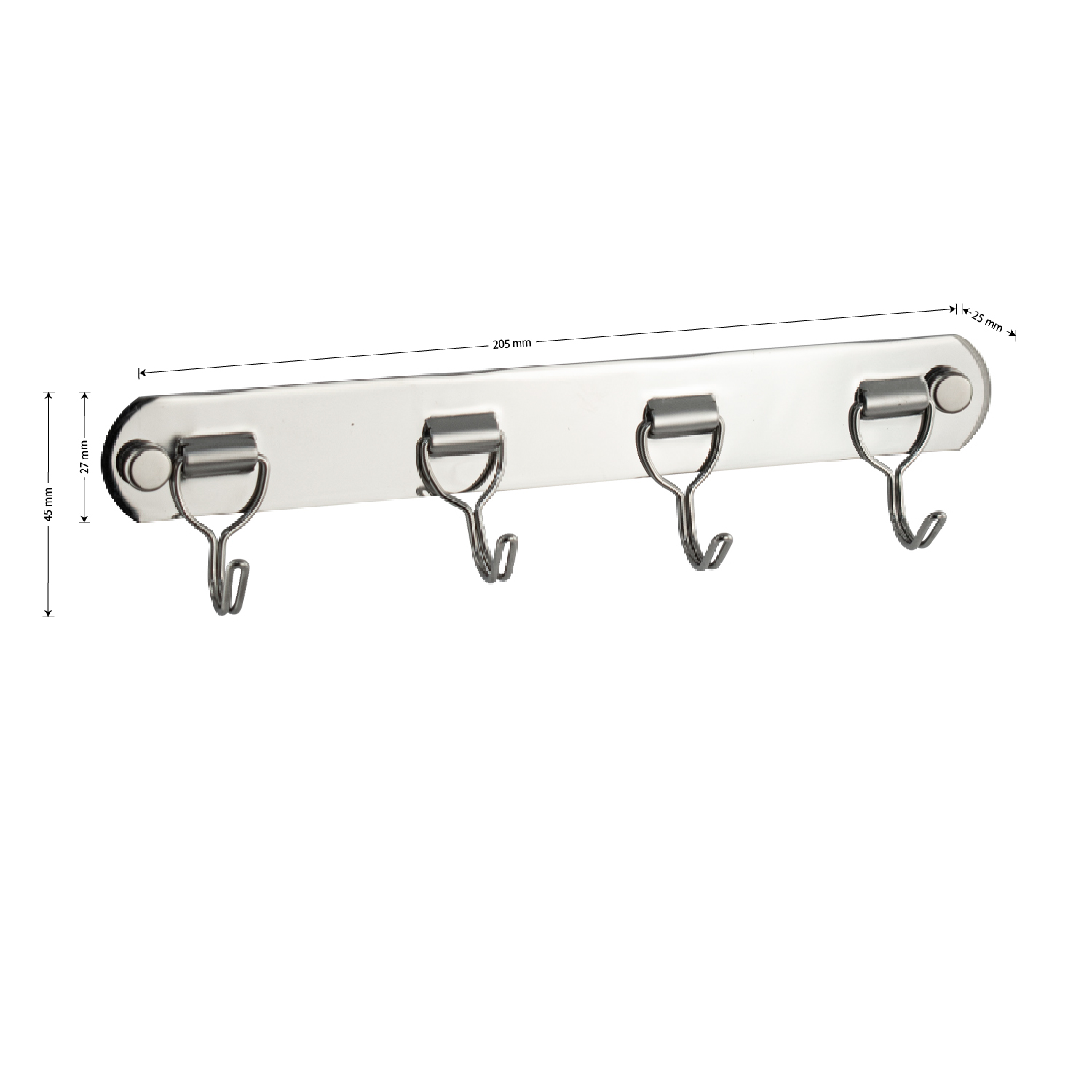 Вешалка - держатель для принадлежностей, металлический, хромированный, с четырьмя крючками. Изготовлен из прочной нержавеющей стали марки SUS 304 с хромированным покрытием, которое придает безупречный стильный вид и долговечность. Хромированное покрытие очень стойко переносит истирания и обеспечивает зеркальный блеск изделия. На держателе с легкостью можно размещать вещи для сушки или вешать, как полотенца, так и одежду перед походом в душ. Идеально подойдет не только для ванной, но и для кухни, а также для дачи или гаража - при необходимости на держатель можно вешать любые предметы. Изделие крепится к стене с помощью дюбелей и саморезов (входят в комплект). Габаритные размеры: длина 255 мм, высота 45 мм, глубина 25 мм, высота планки 27 мм. Вес - 0,060 кг, объём - 0,0003 м3.