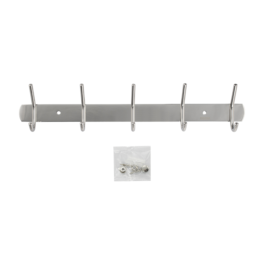 Вешалка - держатель для принадлежностей, металлический, хромированный, с пятью двойными крючками. Изготовлен из прочной нержавеющей стали марки SUS 304 с хромированным покрытием, которое придает безупречный стильный вид и долговечность. Хромированное покрытие очень стойко переносит истирания и обеспечивает зеркальный блеск изделия. На держателе с легкостью можно размещать вещи для сушки или вешать, как полотенца, так и одежду перед походом в душ. Идеально подойдет не только для ванной, но и для кухни, а также для дачи или гаража - при необходимости на держатель можно вешать любые предметы. Изделие крепится к стене с помощью дюбелей и саморезов (входят в комплект). Габаритные размеры: длина 365 мм, высота 75 мм, глубина 35 мм. Вес - 0,272 кг, объём - 0,001 м3.
