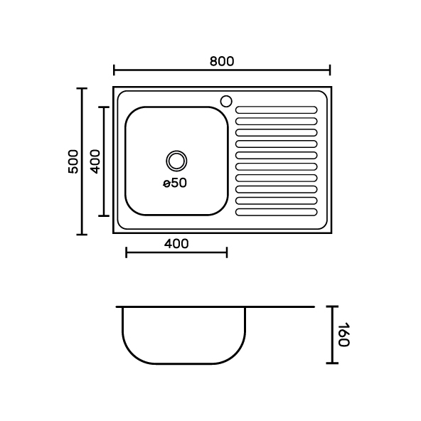 Мойка накладная 50х80 см, левая, толщина 0,4 мм, глубина 160 мм, без сифона
