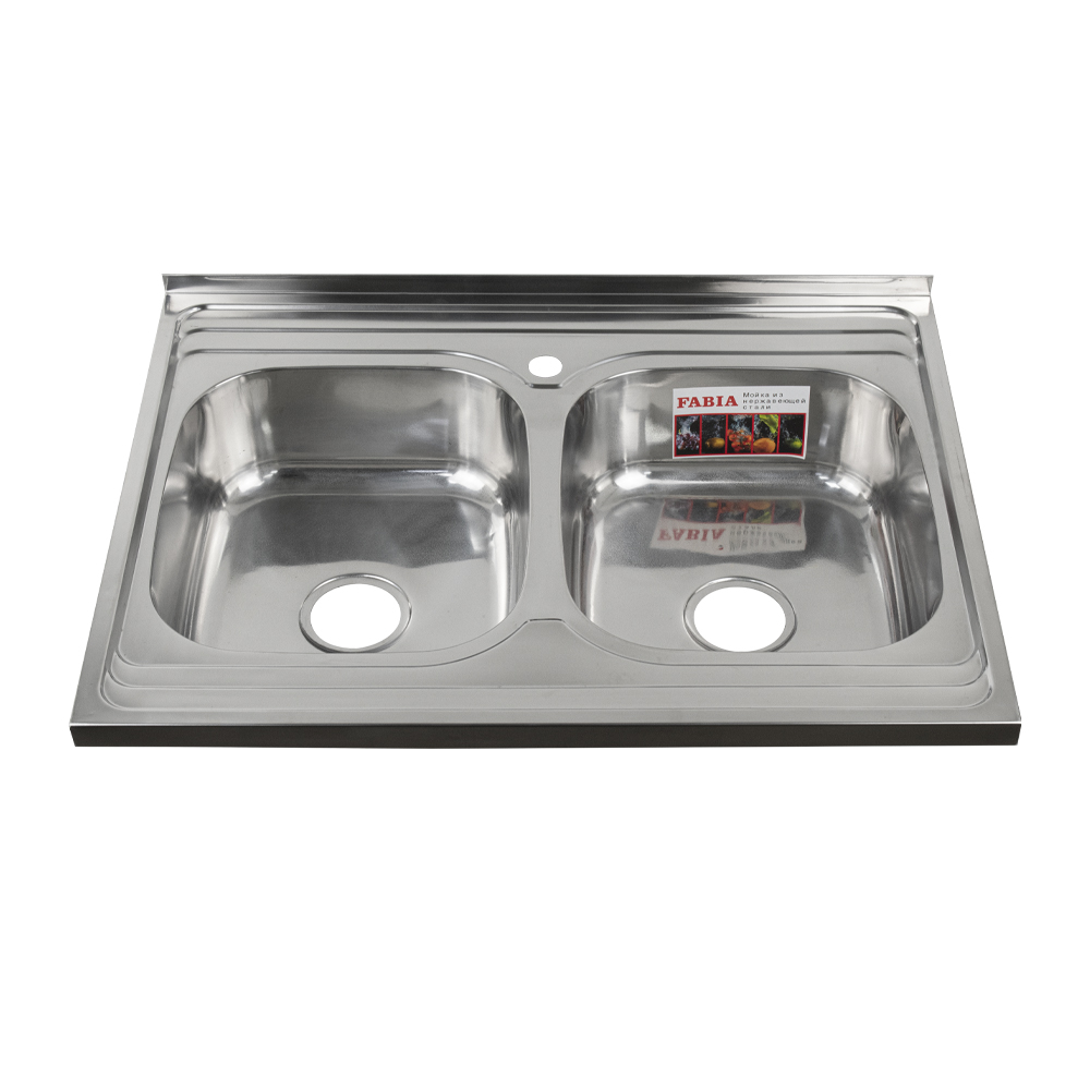 Накладная мойка FABIA с двумя чашами из нержавеющей стали отличный вариант для кухни, она прослужит многие годы. Классическая форма и хромированный цвет гармонично впишутся в любой интерьер и никогда не выйдут из моды. Оптимальный размер позволяет свободно мыть посуду, без страха её разбить. Мойка устанавливается на тумбочку. Практичная площадка, расположенная по центру, даёт возможность вмонтировать любую понравившуюся модель смесителя. В комплекте двойной сифон с переливом. Габаритные размеры: ширина 800 мм, длина 800 мм, глубина 160 мм, толщина стали 0,6 мм. Вес - 4,900 кг, объём - 0,03921 м3.