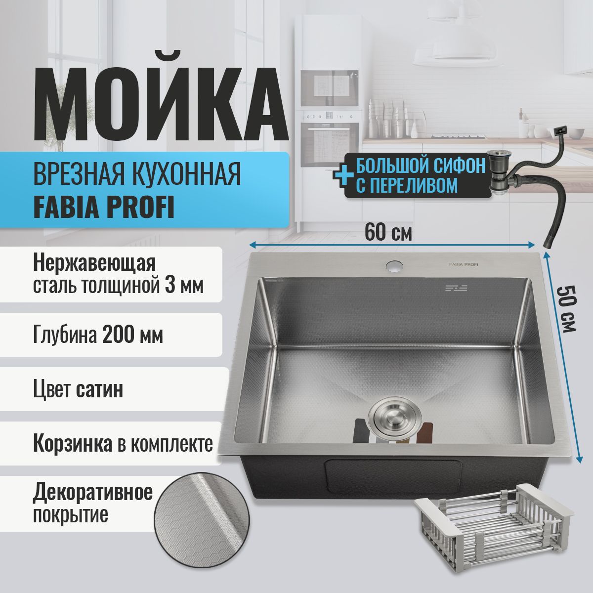 Мойка врезная, матовая, большой сифон с переливом. Сифон с углубленной горловиной, мусоросборником и крышкой. Врезная кухонная мойка произведена из премиальной нержавеющей стали AISI 304, обладает повышенной прочностью. Особенность мойки заключается в конструкции ее дна, имеющего небольшой уклон. Благодаря такой особенности, вода быстрее уходит в слив, не застаивается, что способствует поддержанию гигиеничности в чаше. Скругленные внутренние углы облегчают уход за мойкой, препятствуют скоплению частичек грязи. Тихой в использовании мойку делает шумоизолирующее покрытие и накладки с обратной стороны мойки. В комплект входит универсальная раздвижная корзина, коврик, сифон, мойка, крепёж. Габаритные размеры: ширина 600 мм, длина 500 мм, глубина 220 мм, толщина основания 3,0 мм, чаша 0,8 мм. Вес - 9,000 кг, объём - 0,08845 м3.