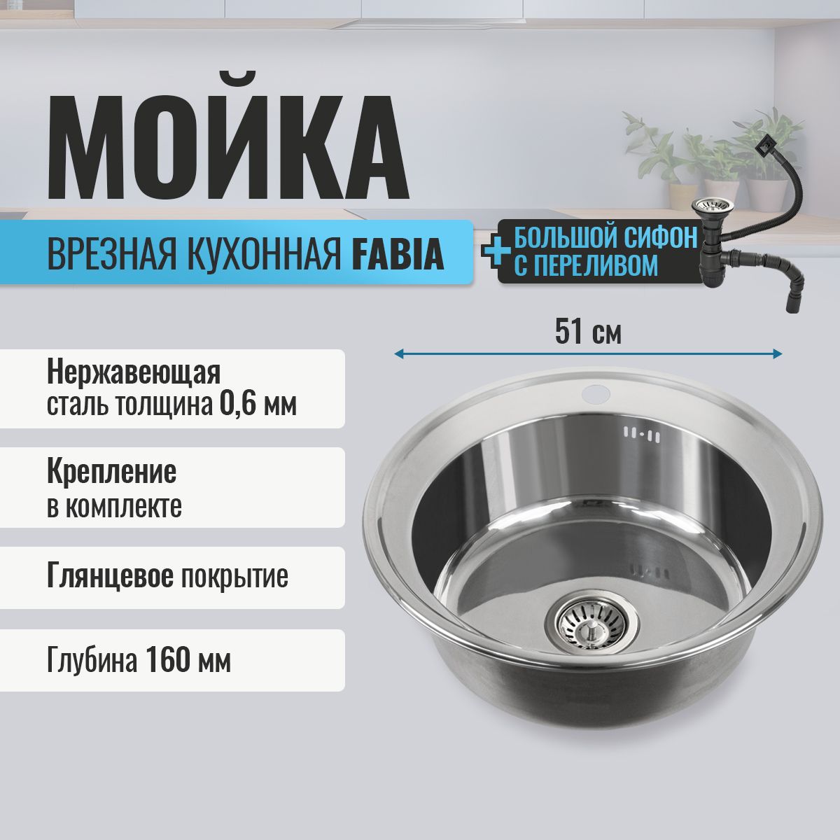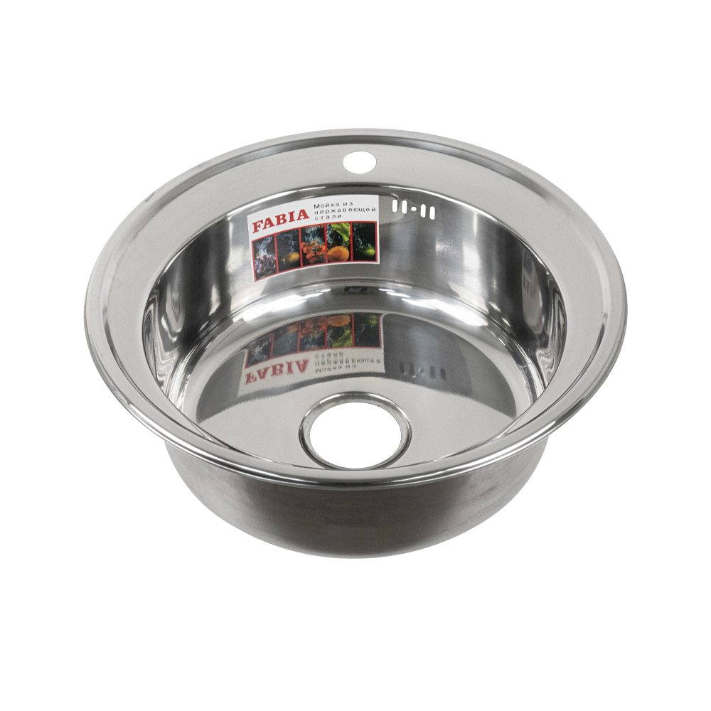 Врезная мойка FABIA из нержавеющей стали, отличный вариант для кухни, она прослужит многие годы. Классическая форма и хромированный цвет гармонично впишутся в любой интерьер и никогда не выйдут из моды. Оптимальный размер позволяет свободно мыть посуду, без страха её разбить. Мойка врезается в столешницу. Специальное дополнительное антишумовое покрытие, нанесенное на обратную сторону чаш, разработано для снижения шума воды в мойке. Конструкция краев мойки, крепления и специальная уплотнительная прокладка обеспечивает максимально плотное прилегание к столешнице и защищает от протекания. Практичная площадка, расположенная по центру, даёт возможность вмонтировать любую понравившуюся модель смесителя. В комплекте сифон с большой горловиной с переливом, крепёж. Габаритные размеры: d = 510 мм, глубина 160 мм, толщина стали 0,6 мм. Вес - 2,000 кг, объём - 0,01285 м3.