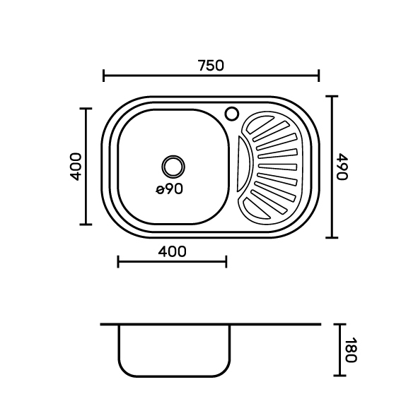 Мойка врезная 75х49 см, левая, ГРАФИТ, толщина 0,8 мм, глубина 180 мм + большой сифон с переливом