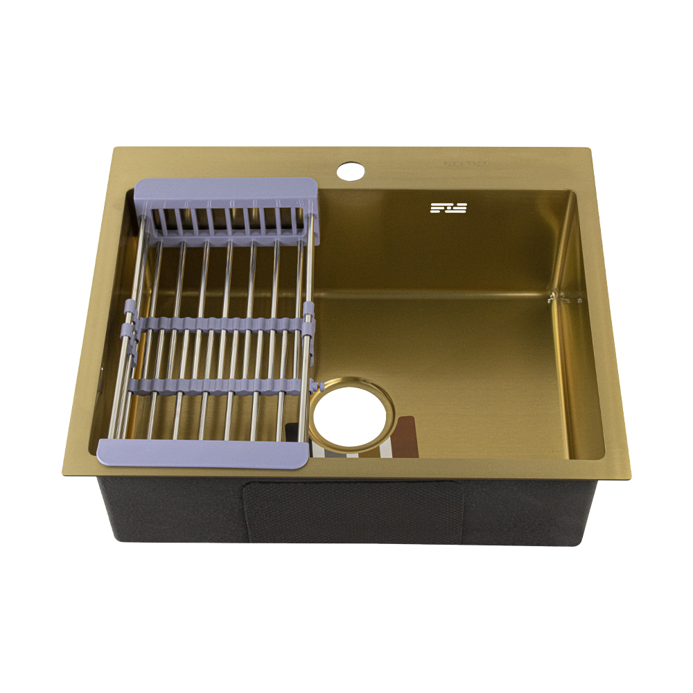 Мойка врезная, золото, большой сифон с переливом. Сифон с углубленной горловиной, мусоросборником и крышкой. Врезная кухонная мойка произведена из премиальной нержавеющей стали AISI 201, обладает повышенной прочностью. Особенность мойки заключается в конструкции ее дна, имеющего небольшой уклон. Благодаря такой особенности, вода быстрее уходит в слив, не застаивается, что способствует поддержанию гигиеничности в чаше. Скругленные внутренние углы облегчают уход за мойкой, препятствуют скоплению частичек грязи. Тихой в использовании мойку делает шумоизолирующее покрытие и накладки с обратной стороны мойки. В комплект входит универсальная раздвижная корзина, коврик, сифон, мойка, крепёж. Габаритные размеры: ширина 600 мм, длина 500 мм, глубина 200 мм, толщина основания 3,0 мм, чаша 0,8 мм. Вес - 9,000 кг, объём - 0,08845 м3.