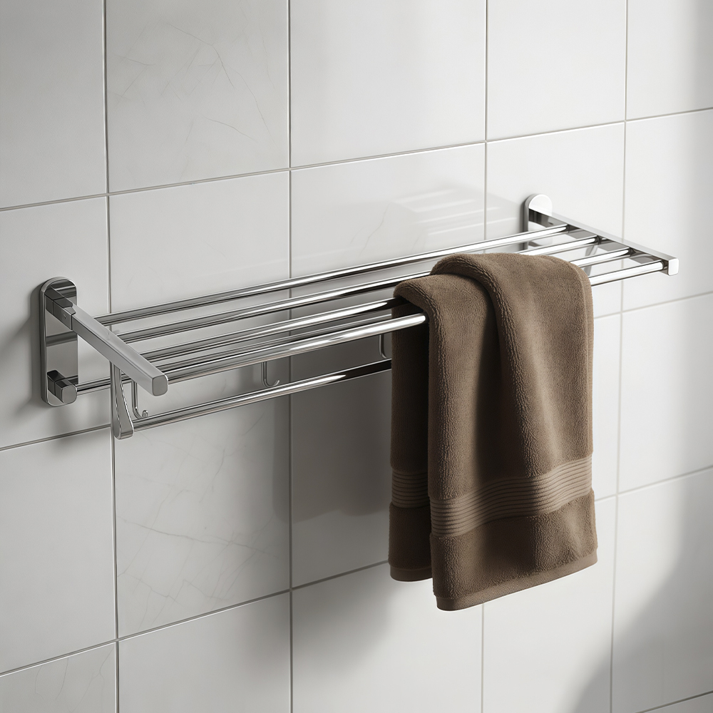 Полка для полотенца с опорой большая, для ванной, привлекает своим современным дизайном, многофункциональностью и надежностью конструкции. Откидывающаяся на 90° верхняя часть полки в ванную комнату позволяет размещать её даже в самых тесных помещениях. Кухня, ванная, прихожая, кладовка или гардеробная - эта полка идеально подойдет везде. Металлическая полка оснащена дополнительной перекладиной и крючками. Безупречно отшлифованная нержавеющая сталь делает её устойчивой к влаге и исключает появление ржавчины. Полка для ванной функциональное и практичное решение для любого интерьера. Материал изготовления — нержавеющая сталь марки 304. Хромированное покрытие очень стойко переносит истирания и обеспечивает зеркальный блеск изделия. Идеально подойдет не только для ванной, но и для кухни. Изделие крепится к стене с помощью дюбелей и саморезов (входят в комплект). Размеры: ширина 600 мм, глубина 240 мм, высота 150 мм. Вес - 2,200 кг, объём - 0,01610 м3.
