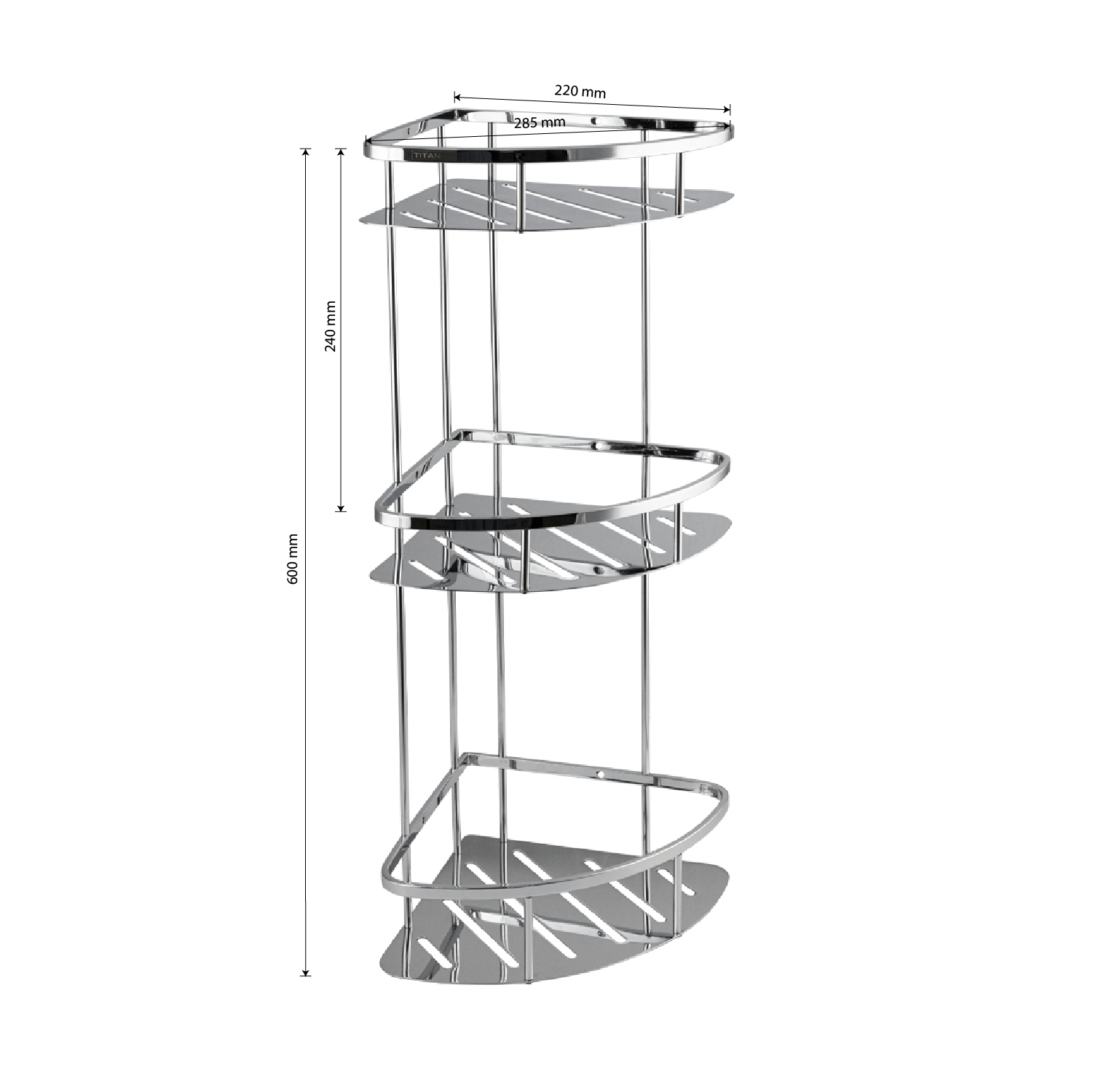 Полочка для принадлежностей закруглённая с литым дном трёхэтажная, обладает высокими эксплуатационными характеристиками и подходит для использования дома, в общественных местах: отелях, ресторанах и пр. Изготовлена из прочной нержавеющей стали с хромоникелевым покрытием, которое придает безупречный глянцевый блеск и долговечность. Аксессуар не занимают много места, надежно фиксируется к стене при помощи набора креплений (входят в комплект) и служит удобным местом для хранения бытовых и косметических средств. Габаритные размеры: длина стороны 220 мм, ширина 285 мм, расстояние между полками 240, общая высота 600 мм. Вес - 3,000 кг, объём - 0,03491 м3.