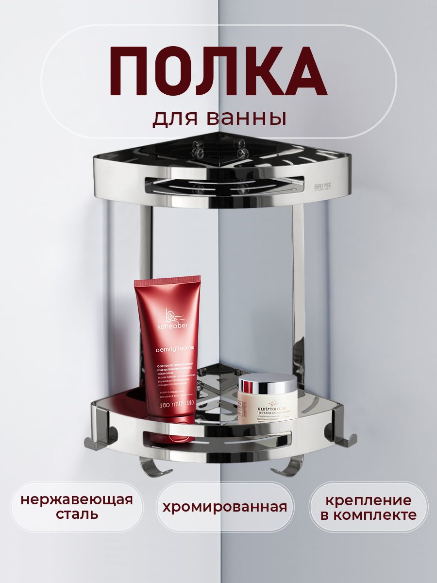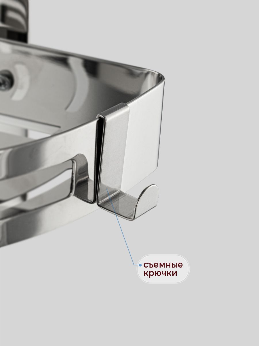 Полочка для принадлежностей, треугольная, угловая, с литым дном, двухэтажная, с двумя крючками, обладает высокими эксплуатационными характеристиками и подходит для использования дома, в общественных местах: отелях, ресторанах и пр. Изготовлена из прочной нержавеющей стали с хромоникелевым покрытием, которое придает безупречный глянцевый блеск и долговечность. Аксессуар не занимает много места, надежно фиксируется к стене при помощи набора креплений (входят в комплект) и служит удобным местом для хранения бытовых и косметических средств. Габаритные размеры: высота 370 мм, ширина 290 мм, глубина 220 мм, расстояние между полками 220 мм. Вес - 1,600 кг, объём - 0,00770 м3.