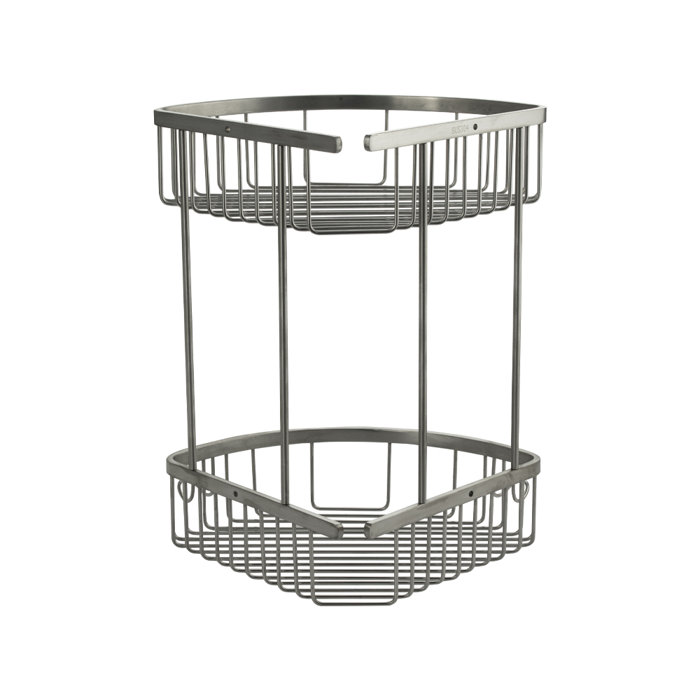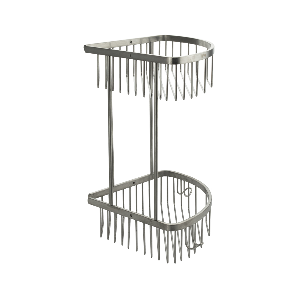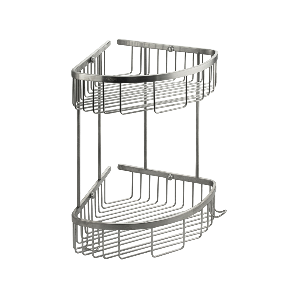 Полочка для принадлежностей треугольная, угловая, закруглённая, решётка, двухэтажная, обладает высокими эксплуатационными характеристиками и подходит для использования дома, в общественных местах: отелях, ресторанах и пр. Изготовлена из прочной нержавеющей стали марки SUS 304 с матовым покрытием, которое придает безупречный стильный вид и долговечность. Металлическая полка оснащена крючками. Аксессуар не занимает много места, надежно фиксируется к стене при помощи набора креплений (входят в комплект) и служит удобным местом для хранения бытовых и косметических средств. Габаритные размеры: высота 345 мм, ширина 290 мм, длина стороны 220 мм, расстояние между полками 205 мм. Вес - 2,000 кг, объём - 0,02168 м3.