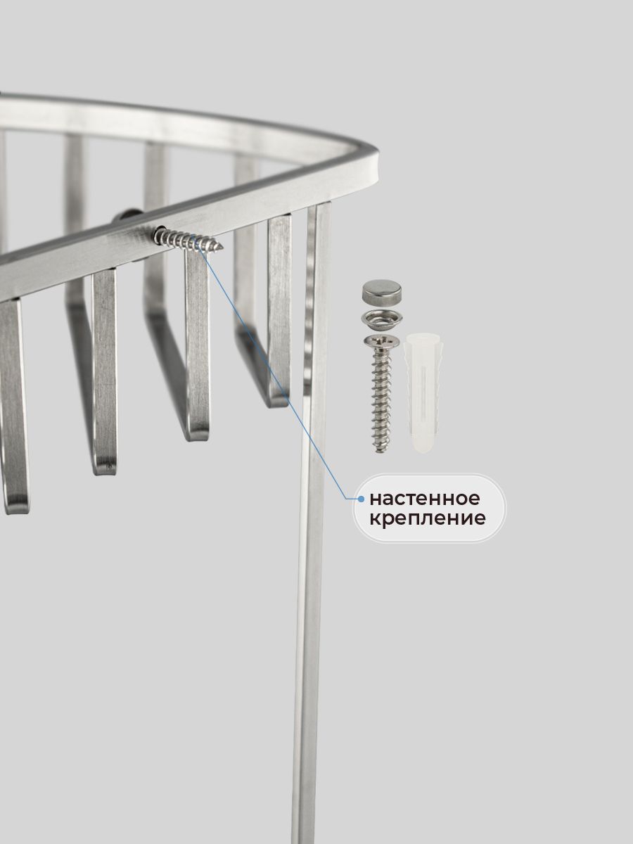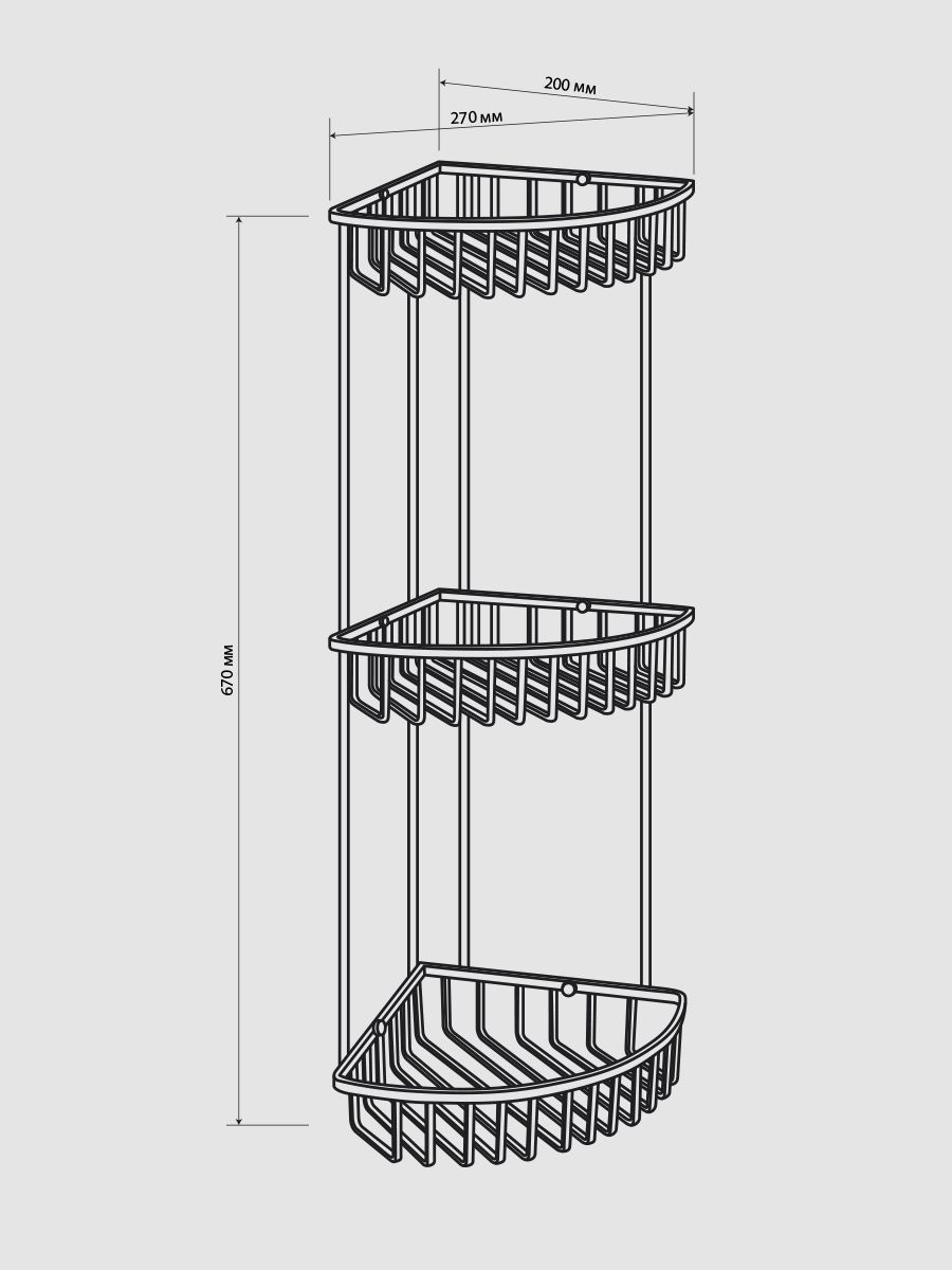 Полочка угловая, овальная, трёхэтажная, для принадлежностей, решётка с плоскими толстыми прутьями, обладает высокими эксплуатационными характеристиками и подходит для использования дома, в общественных местах: отелях, ресторанах и пр. Изготовлена из прочной нержавеющей стали с матовым покрытием, которое придает безупречный внешний вид и долговечность. Аксессуар не занимает много места, надежно фиксируется к стене при помощи набора креплений (входят в комплект) и служит удобным местом для хранения бытовых и косметических средств. Габаритные размеры: высота 670 мм, ширина 270 мм, глубина 200 мм, расстояние между полками 250 мм. Вес - 1,900 кг, объём - 0,01600 м3.