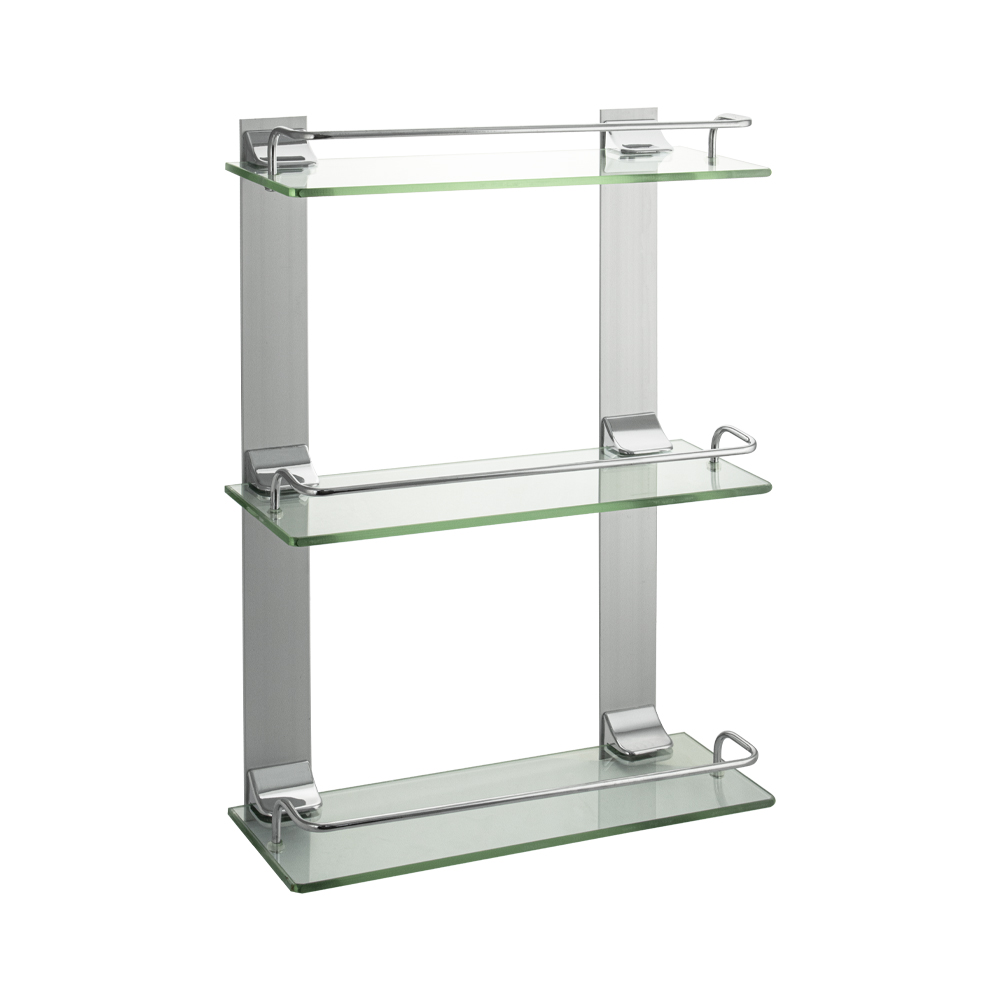 Полка стеклянная, настенная, 3-х этажная. Подвесная трёхэтажная настенная полка для ванной из прочного стекла , толщиной 5 мм с полированными краями о которые невозможно порезаться, с надежной фиксацией к стене с помощью крепления из металла с хромированным покрытием, идеально подходит для хранения различных ванных принадлежностей. Полочка изготовлена из качественного стекла и имеет бортик, предотвращающий падение ванных принадлежностей. Полка для ванной функциональное и практичное решение для любого интерьера. Хромированное покрытие креплений очень стойко переносит истирания и обеспечивает зеркальный блеск изделия. Идеально подойдет не только для ванной, но и для кухни. Изделие крепится к стене с помощью дюбелей и саморезов (входят в комплект). Габаритные размеры: высота 480 мм, ширина 315 мм, глубина 125 мм, расстояние между полками 215 мм. Вес - 2,410 кг, объём - 0,00561 м3.