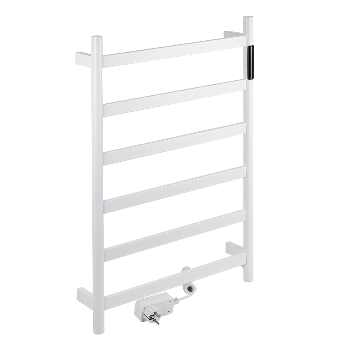 Полотенцесушитель электрический белый матовый, лесенка из нержавеющей стали марки 304, с таймером до 24 часов, регулировка температуры от 35°С до 70°С, тэн из углеродного волокна, гармонично впишется в современный интерьер и поможет поддержать комфортную атмосферу в ванной комнате, работает вне зависимости от отопительного сезона, и его можно разместить в любом месте ванной или даже на стене в комнате. Матовая поверхность устойчива к высоким температурам. Благодаря продуманному расположению труб можно размещать объемный текстиль, сократив время просушки. Установка и ремонт не требуют работы сантехников. Габариты и параметры: ширина 480 мм, высота 730 мм, глубина 90 мм. 6 перекладин, с сухим ТЭНом, 75 W, 220-230 V, 50-60 Гц, t - 55°С, IP 44. Комплект: полотенцесушитель, крепёж, провод с евровилкой для подключения. Вес - 4,0 кг, объём - 0,06 м3