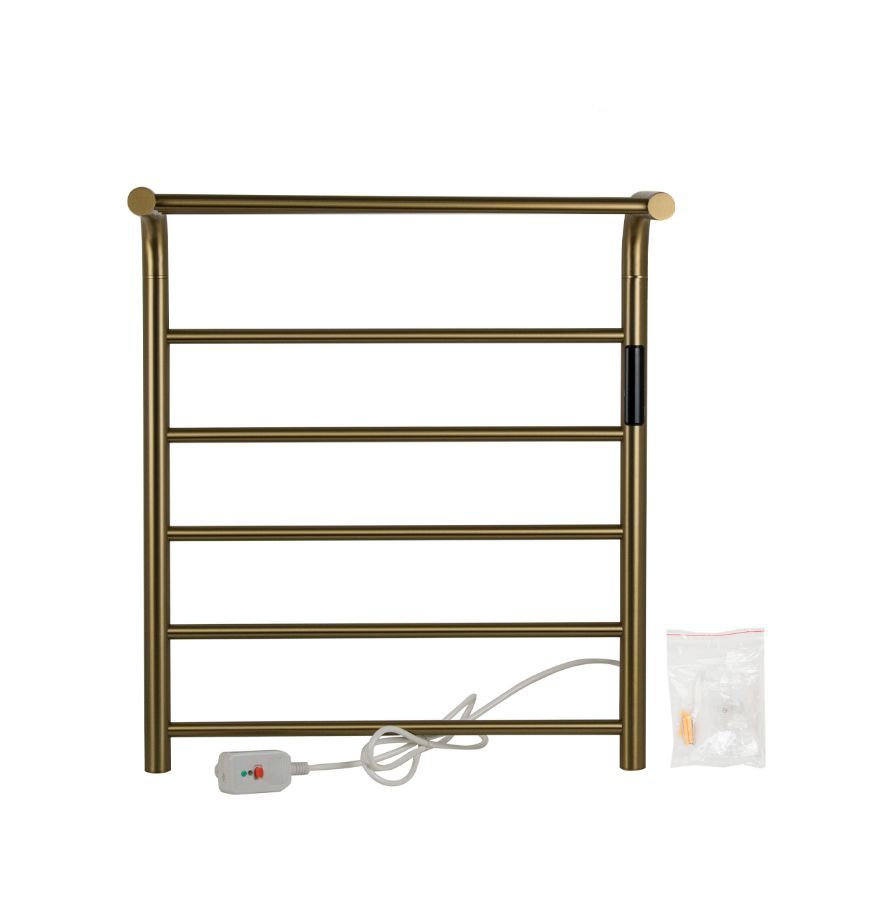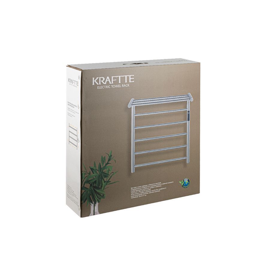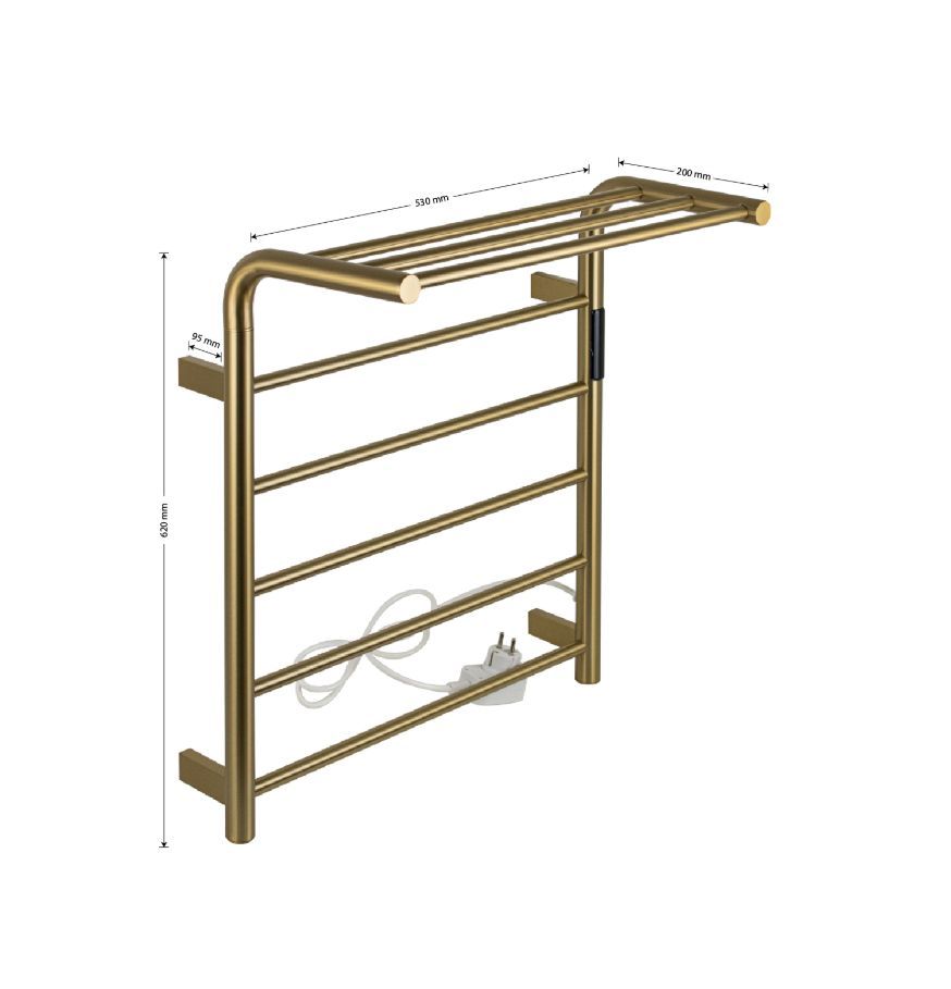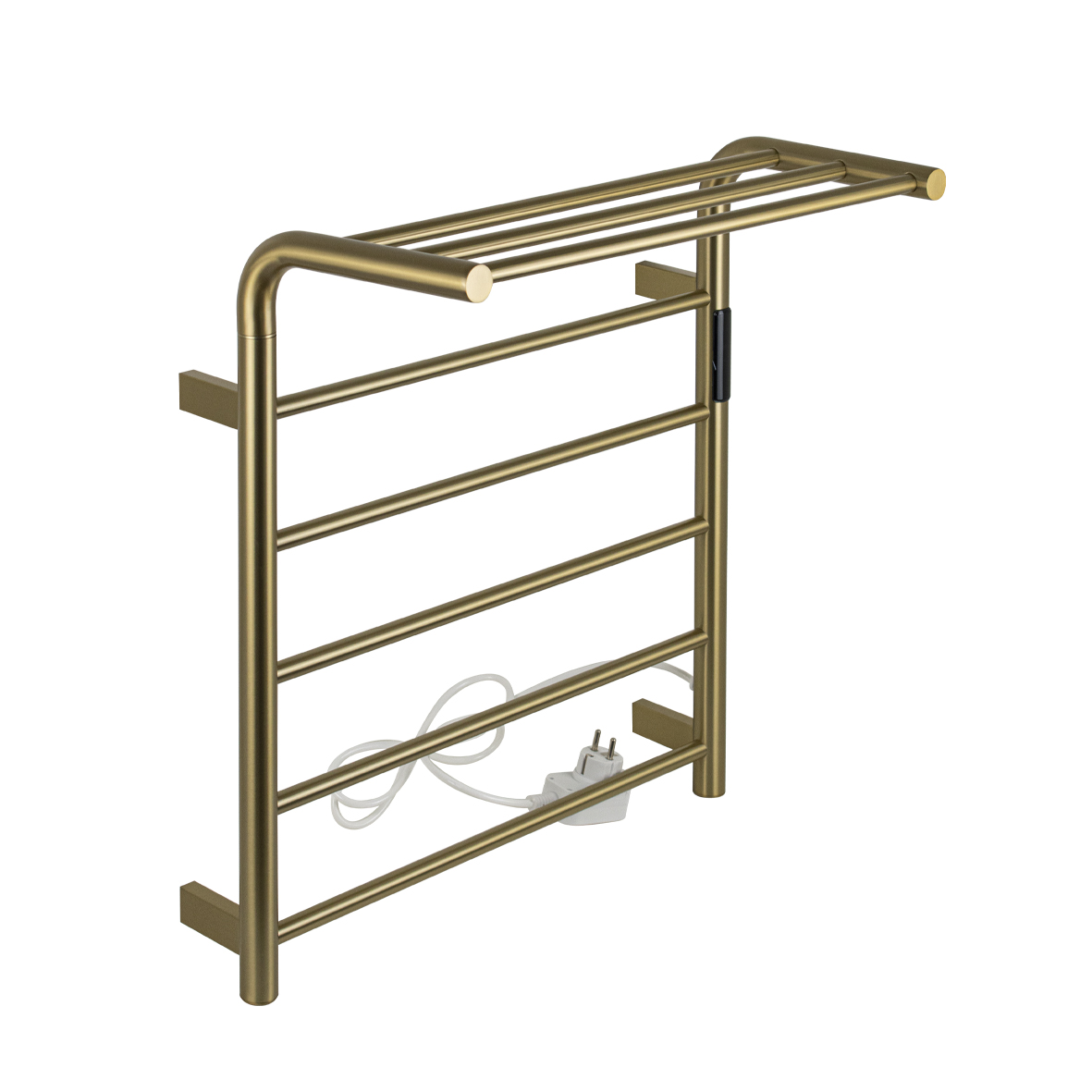 Полотенцесушитель электрический, лесенка с полкой, из нержавеющей стали марки 304, с сенсорным управлением, с таймером до 24 часов, регулировка температуры от 35°С до 70°С, тэн из углеродного волокна, гармонично впишется в современный интерьер и поможет поддержать комфортную атмосферу в ванной комнате, работает вне зависимости от отопительного сезона, и его можно разместить в любом месте ванной или даже на стене в комнате. Матовая поверхность устойчива к высоким температурам. Благодаря продуманному расположению труб можно размещать объемный текстиль, сократив время просушки. Установка и ремонт не требуют работы сантехников. Габариты и параметры: высота 620 мм, ширина 530 мм, полка 295 мм, длина крепления к стене 95 мм. 5 перекладин, с сухим ТЭНом, W, 220-230 V, 50-60 Гц, t - 35-70°С, IP 44. Комплект: полотенцесушитель, крепёж, провод с евровилкой для подключения. Вес - 4 кг, объём - 0,04709 м3.