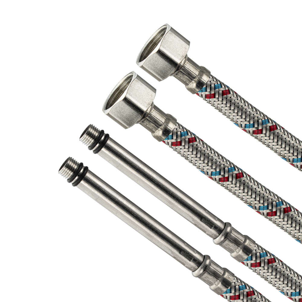 Гибкая подводка для смесителя, пара, гайка - штуцер, 1/2", 60 cм, с внутренней резьбой предназначена для присоединения к трубопроводам сантехнической арматуры и приборов сантехнического назначения (смесителей, душевых кабин, биде, умывальников, унитазов) и подводки воды к агрегатам бытового назначения (водонагревательным приборам, стиральным и посудомоечным машинам, насосам и тд). Оплетка гибкой подводки сплетена из 7 нитей из нержавеющей стали толщиной 0,2 мм. Материал оплетки нержавеющяя сталь. Внутренний шланг (трубка) изготовлен из специальной нетоксичной резины. Внутренний диаметр шланга – 8,5 мм ± 0,5 мм. Наружный диаметр шланга – 12,5 мм ± 0,5 мм. При установке гибкой подводки концевую арматуру необходимо затягивать с усилием не более 4 Нм. Вес - 0,20 кг, объём - 0,00036 м3.