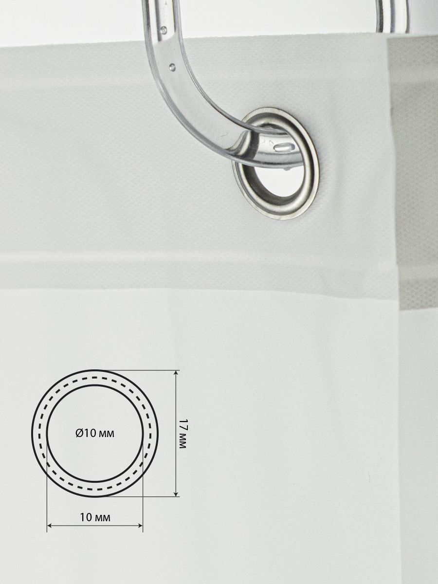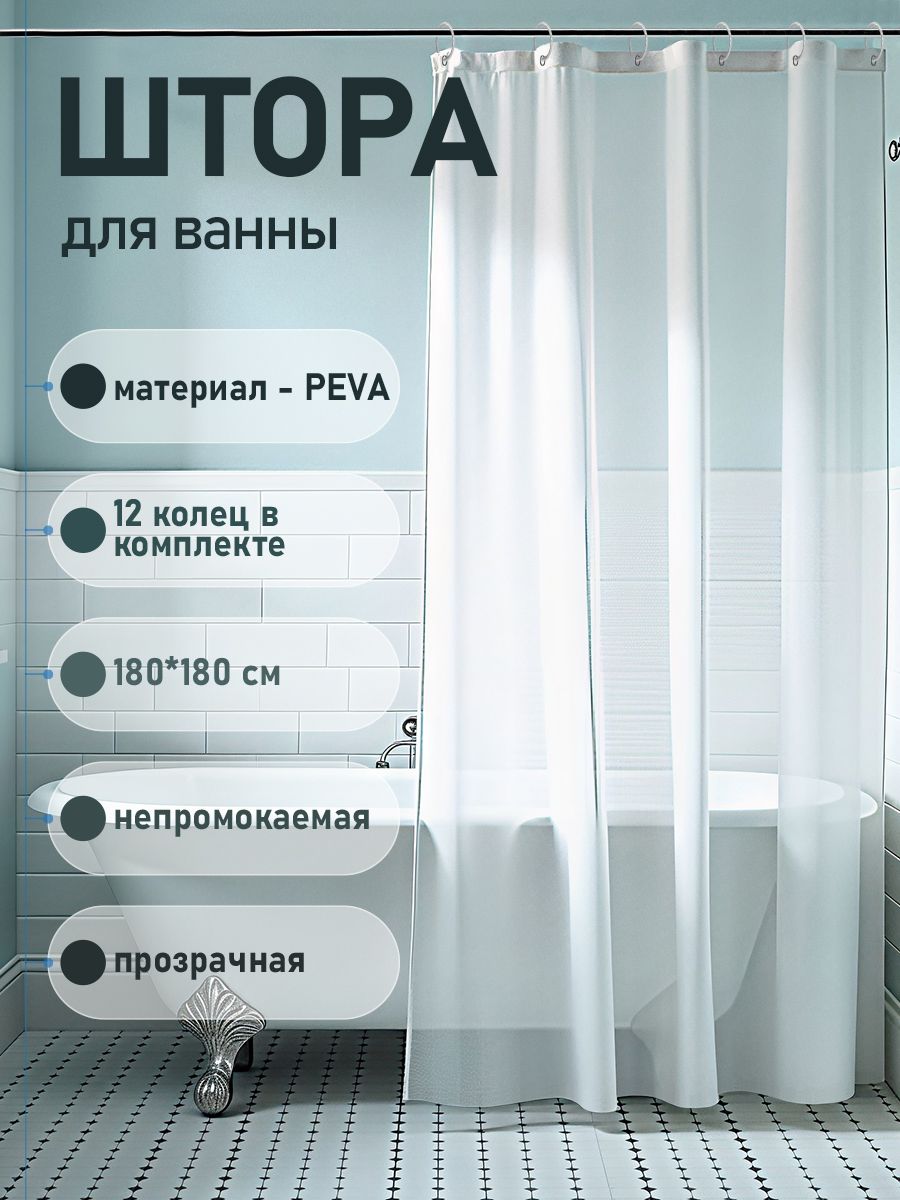 Штора для ванны белая,матовая. Штора подойдет для любого интерьера ванной комнаты, она полупрозрачная и зрительно увеличивает пространство, делает помещение светлым, а мебель и зеркало защищает от брызг. Шторка легкая, но достаточно плотная, водоотталкивающая, имеет стандартные размеры 180 х180 сантиметров. Верхний край шторы уплотнен, для более надежного крепления на кольца, отверстия для колец обрамлены металлическими люверсами из нержавеющей стали. В комплекте прочные пластиковые кольца в количестве 12 штук для крепления к штанге. Изготовлена из современного экологичного материала PEVA, который имеет ряд преимуществ перед другими материалами. В отличии от тканевой она абсолютно водонепроницаема и может не сразу приклеиться к ванне, чтобы улучшить прилипание, полейте бортик ванной водой из душевой лейки. В отличие от шторы из ПВХ, не имеет в составе вредных примесей, токсинов и хлора, гипоаллергенна и без запаха, материал, устойчивый к образованию грибка и плесени. Упакована в прочный пакет. Вес 0,37 кг, об