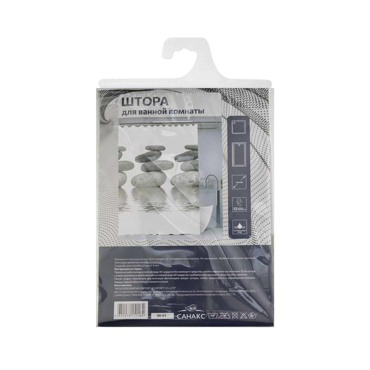 Штора с рисунком, большие камни, матовая, в ванную комнату, с кольцами, ПЕВА, 180 х 180 см.