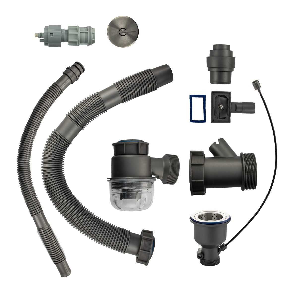 Сифон для кухонных моек, цвет хром, матовый, с диаметром сливного отверстия 90 мм, бутылочного типа с переливом и автоматическим клапаном. С разборным выпуском и нержавеющей решеткой с гофрой, из высокопрочного пластика АБС с затвором от проникновения запахов. Форма сифона позволяет поддерживать хорошую пропускную способность слива сточной воды, выполняя свою главную функцию - формирование гидрозатвора для отсечения неприятных запахов из канализации. Конструкция позволяет легко, без демонтажа, снять отстойник (стакан) и почистить сифон в случае засорения, достать случайно упавшие в слив раковины мелкие ценные вещи. Сифон прост в установке. Габаритные размеры: высота стакана 220 мм, верхняя крышка 110 мм. Комплект: сифон, гофра, перелив, уплотнения. Вес - 1,1 кг, объём - 0,0086 м3.