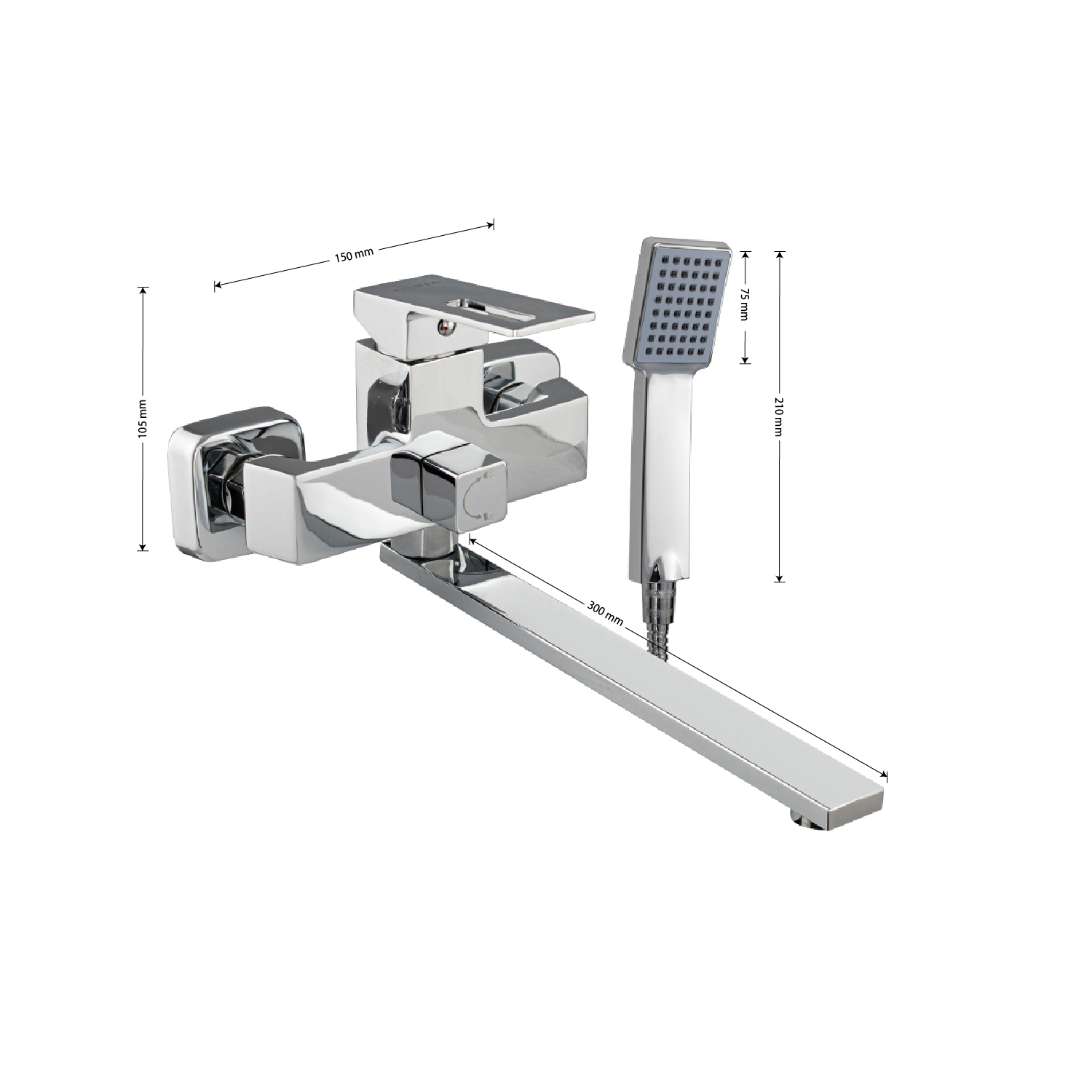 Смеситель хромированный в ванную / душевую комнату с длинным, плоским изливом, тяжёлый, массивный квадратный корпус, шаровый, с дивертором м/к на корпусе, ручка с прорезью. Материал изготовления — ЦАМ (цинк-алюминий-медь) + нержавеющая сталь. Картридж d = мм, литая ручка, аэратор для экономии воды, чашки и эксцентрики из нержавеющей стали. Габаритные размеры: ширина 150 мм, высота корпуса 105 мм, длина излива 300 мм, душевая лейка 210 мм, шланг 150 см. Вес - 1,8 кг, объём - 0,00508 м3. В комплекте паспорт, корпус с изливом, дивертор, душевая лейка, шланг, кронштейн, комплект крепежа и прокладок.