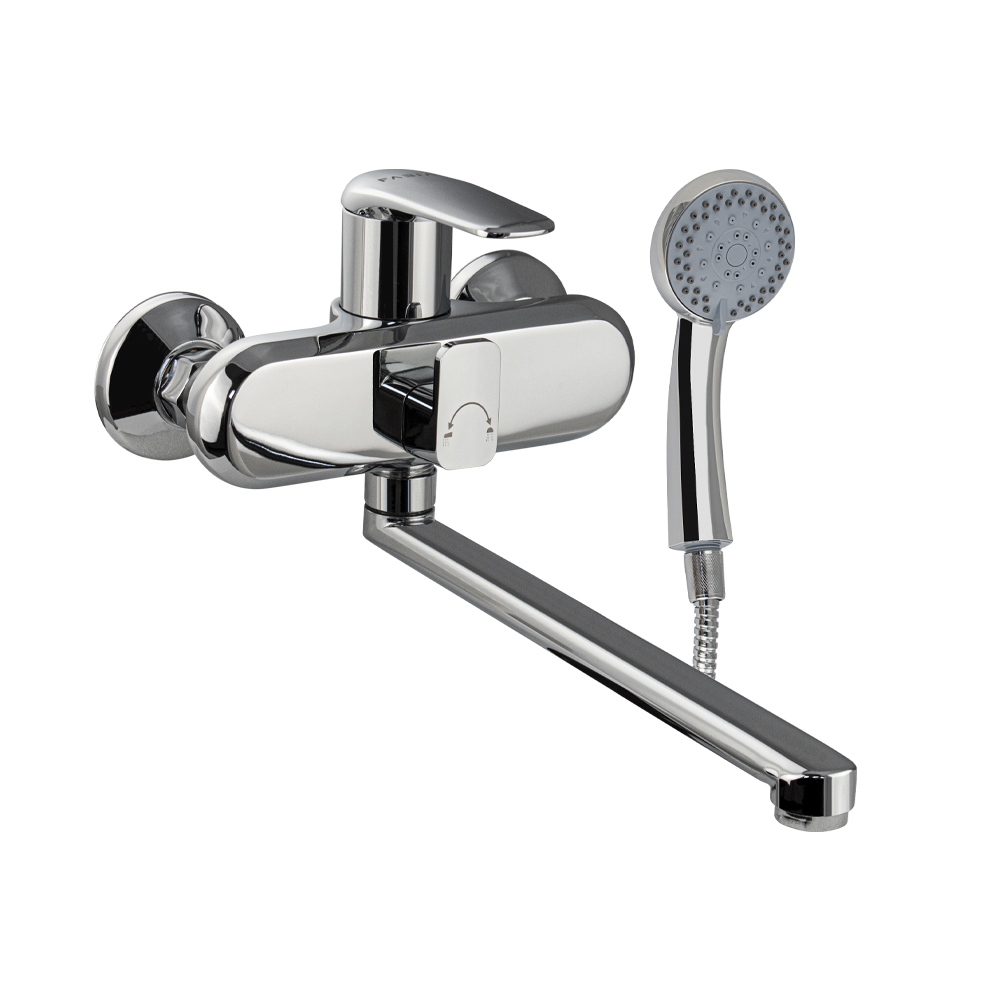 Смеситель хромированный в ванную / душевую комнату с длинным, плоским изливом, тяжёлый, массивный корпус, шаровый, с дивертором м/к на корпусе. Материал изготовления — ЦАМ (цинк-алюминий-медь) + нержавеющая сталь. Картридж d = мм, литая ручка, аэратор для экономии воды, чашки и эксцентрики из нержавеющей стали. Габаритные размеры: ширина 150 мм, высота корпуса 135 мм, длина излива 300 мм, душевая лейка 75 мм, шланг 150 см. Вес - 2 кг, объём - 0.0050 м3. В комплекте паспорт, корпус с изливом, дивертор, душевая лейка, шланг, кронштейн, комплект крепежа и прокладок.