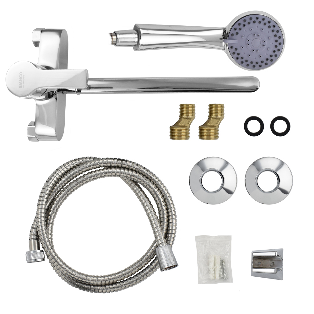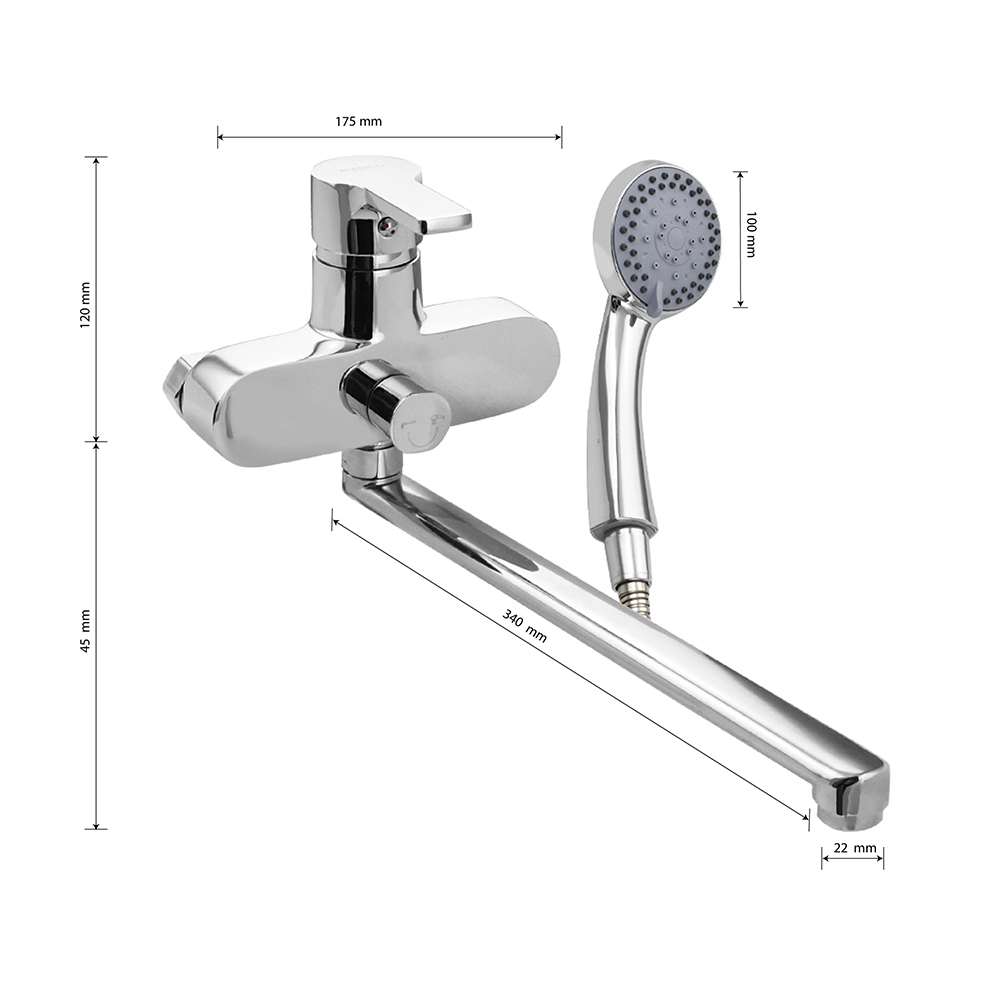 Смеситель хромированный в ванную / душевую комнату с длинным, плоским изливом, тяжёлый, массивный корпус, шаровый с дивертором м/к на корпусе. Материал изготовления — ЦАМ (цинк-алюминий-медь). Картридж d = 40 мм, литая ручка, аэратор для экономии воды, чашки и эксцентрики из нержавеющей стали. Габаритные размеры: ширина 150 мм, высота корпуса 165 мм, длина излива 340 мм, трёхрежимная душевая лейка d = 100 мм, шланг 150 см. Вес - 2,000 кг, объём - 0,00702 м3. В комплекте паспорт, корпус с изливом, дивертор, душевая лейка, шланг, кронштейн, комплект крепежа и прокладок.