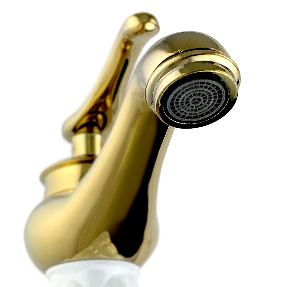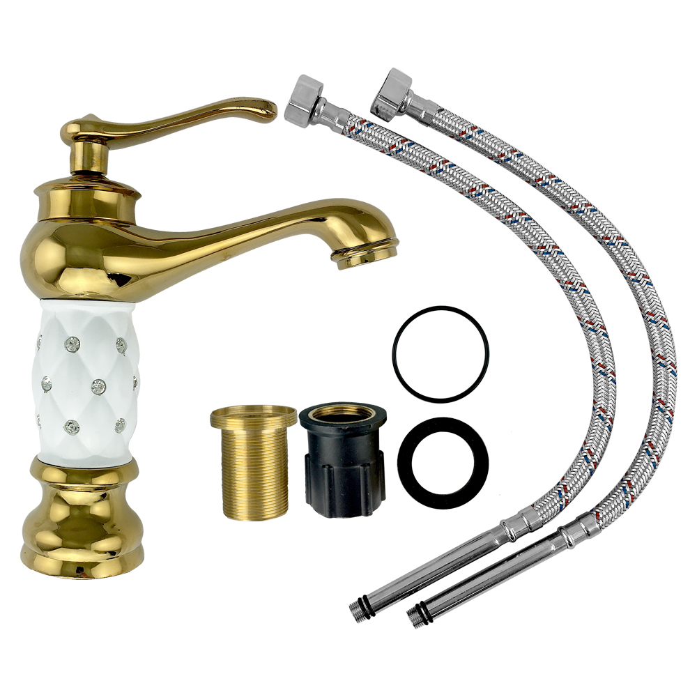 Смеситель для раковины, светлое золото с белой керамичекой вставкой, со стразами на корпусе, с коротким литым изливом, литой корпус, литая ручка, шаровый. Материал изготовления — ЦАМ (цинк-алюминий-медь) + нержавеющая сталь. Крепление резьба - гайка, картридж d = 40 мм. Аэратор для экономии воды. Габаритные размеры: высота 210 мм, длина 170 мм, длина излива 110 мм, диаметр посадочного седла 60 мм, длина резьбы 50 мм, длина подводки 400 мм. Вес - 1,150 кг, объём - 0,00346 м3. В комплекте паспорт, корпус, подводка 1/2, крепеж, набор прокладок.