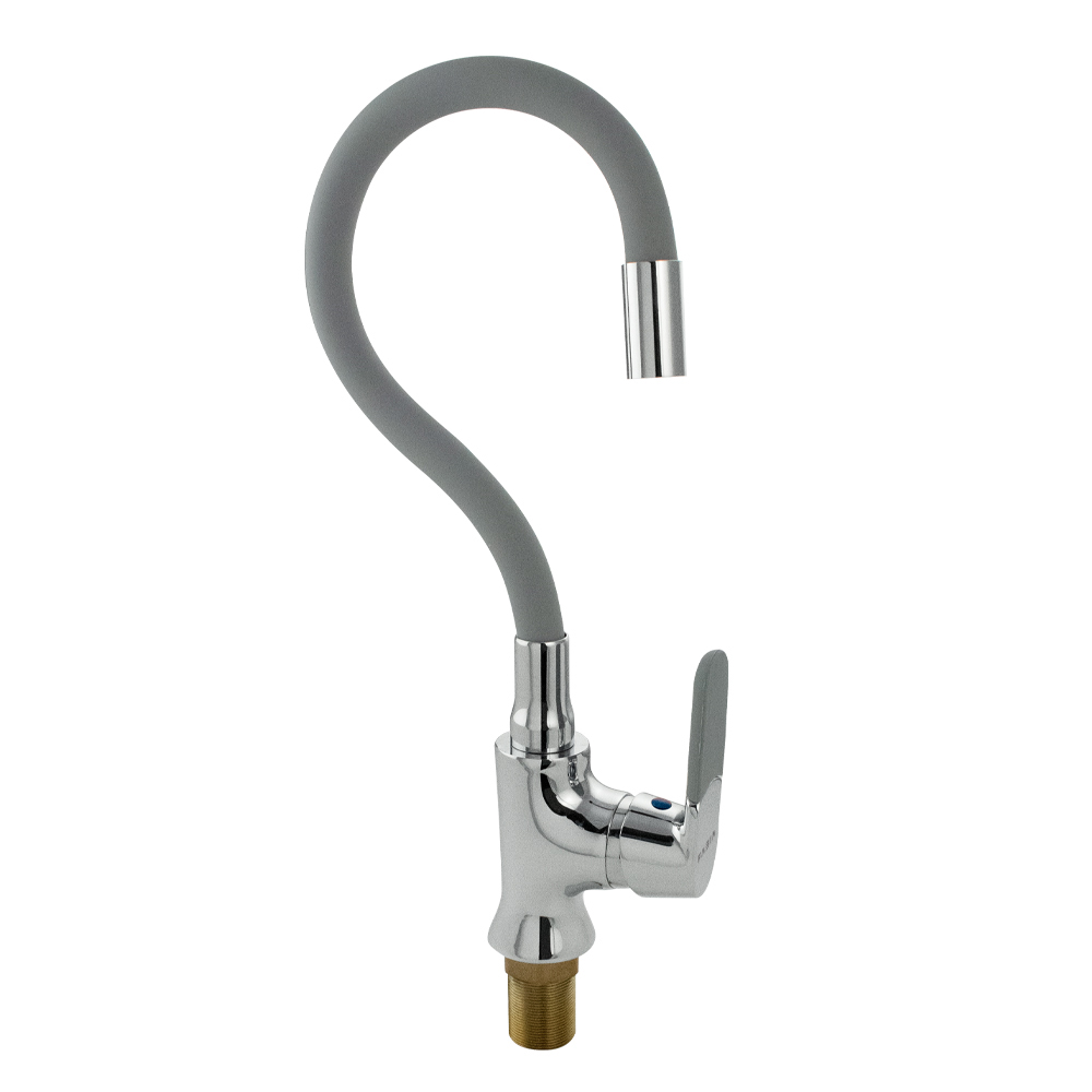 Смеситель для кухонной мойки и раковин, хромированный, боковой, шаровый d = 40 мм, массивный корпус с гибким изливом серого цвета, с аэратором для экономии воды. Материал изготовления — ЦАМ (цинк-алюминий-медь). Крепление резьба - гайка, литая ручка с силиконовой накладкой. Габаритные размеры: высота 300 - 400 мм, длина 180 - 300 мм, диаметр посадочного седла 50 мм, длина резьбы 50 мм, длина подводки 600 мм. Вес - 1,500 кг, объём - 0,00510 м3. В комплекте корпус с изливом, паспорт, подводка 1/2, крепёж. Габаритные размеры коробки: ширина 295 мм, высота 65 мм, глубина 185 мм.