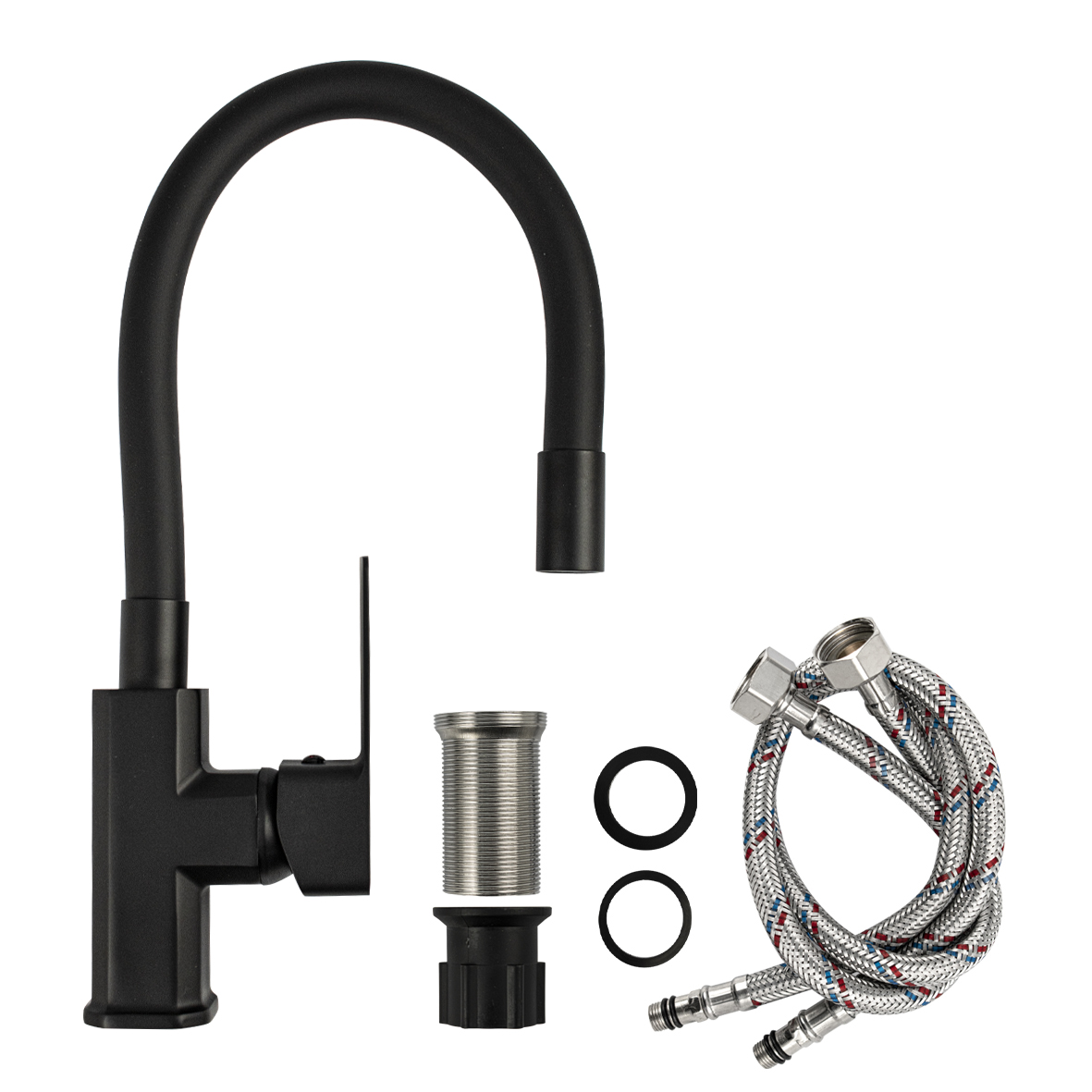 Смеситель для кухонной мойки и раковин, черный, боковой, шаровый d = мм, массивный корпус с гибким изливом чёрного цвета, с аэратором для экономии воды. Материал изготовления — ЦАМ (цинк-алюминий-медь). Крепление резьба - гайка, литая ручка. Вес - 1.5 кг, объём - 0.00585 м3. В комплекте корпус с изливом, паспорт, подводка 1/2, крепёж. Габаритные размеры коробки: ширина 200 мм, высота 400 мм, высота резьбы 45 мм, диаметр посадочного седла 45 мм.