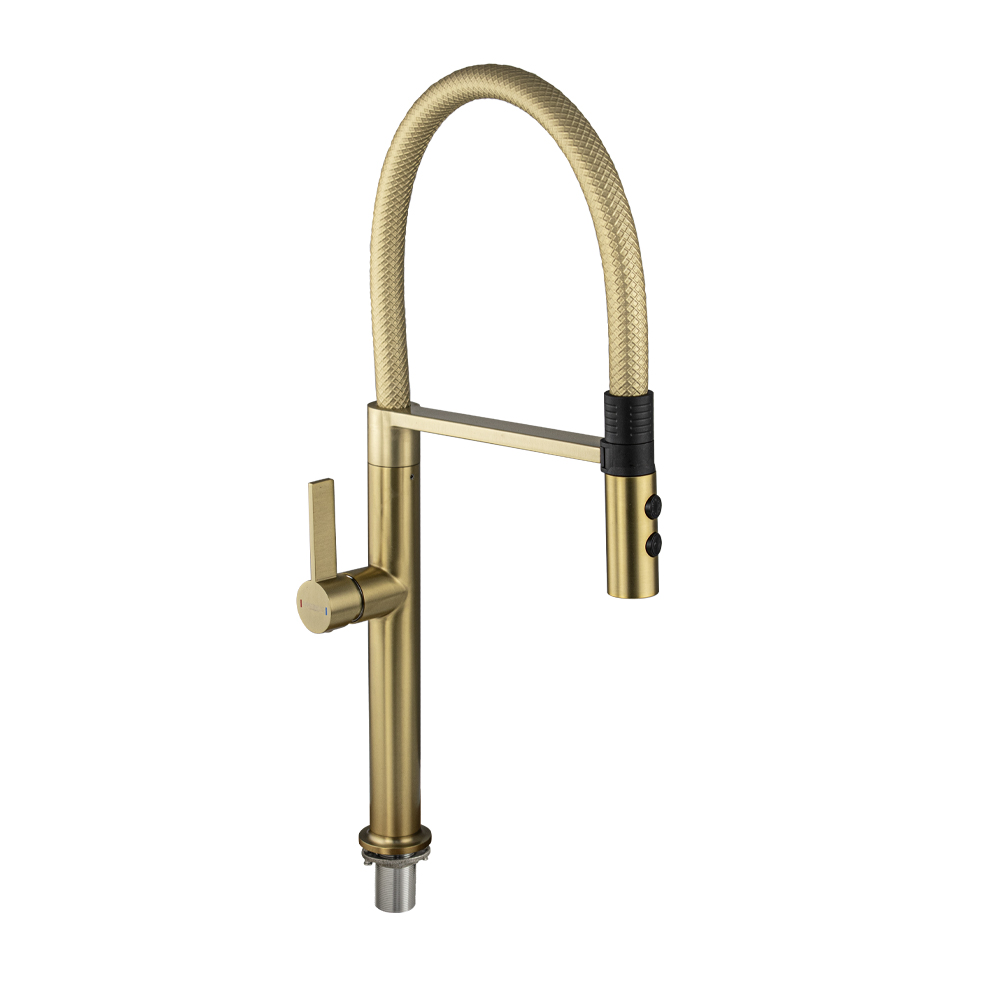 Смеситель для кухни, с гибким рельефным изливом с магнитной фиксацией, двухрежимный аэратор, корпус из нержавеющей стали марка SUS 304, цвет корпуса матовое ЗОЛОТО.