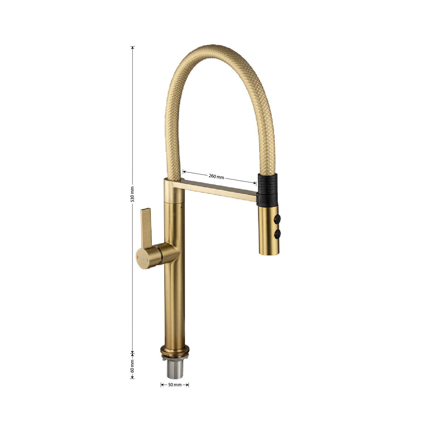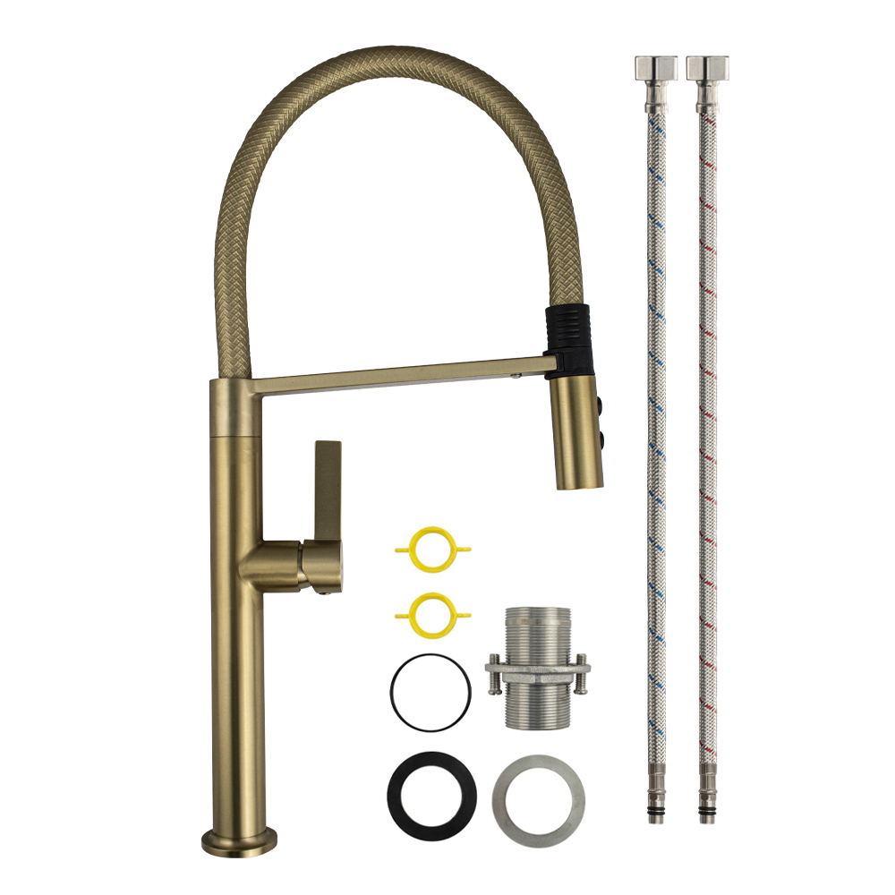Смеситель для кухонной мойки с гибким рельефным изливом с магнитной фиксацией, двухрежимный аэратор, литой корпус цвета матовое золото, из нержавеющей стали марка SUS 304. Крепление резьба - гайка, картридж d =  мм, ручка шток. Аэратор для экономии воды. Такая модель может использоваться на домашней кухне, на даче, в медицинских учреждениях и общественных местах. Габаритные размеры: высота 530 мм, длина 260 мм, диаметр посадочного седла 50 мм, длина резьбы 60 мм, длина подводки  500 мм. Вес - 2.28 кг, объём - 0.01092 м3. В комплекте паспорт, корпус с изливом, подводка 1/2, крепеж, набор прокладок.
