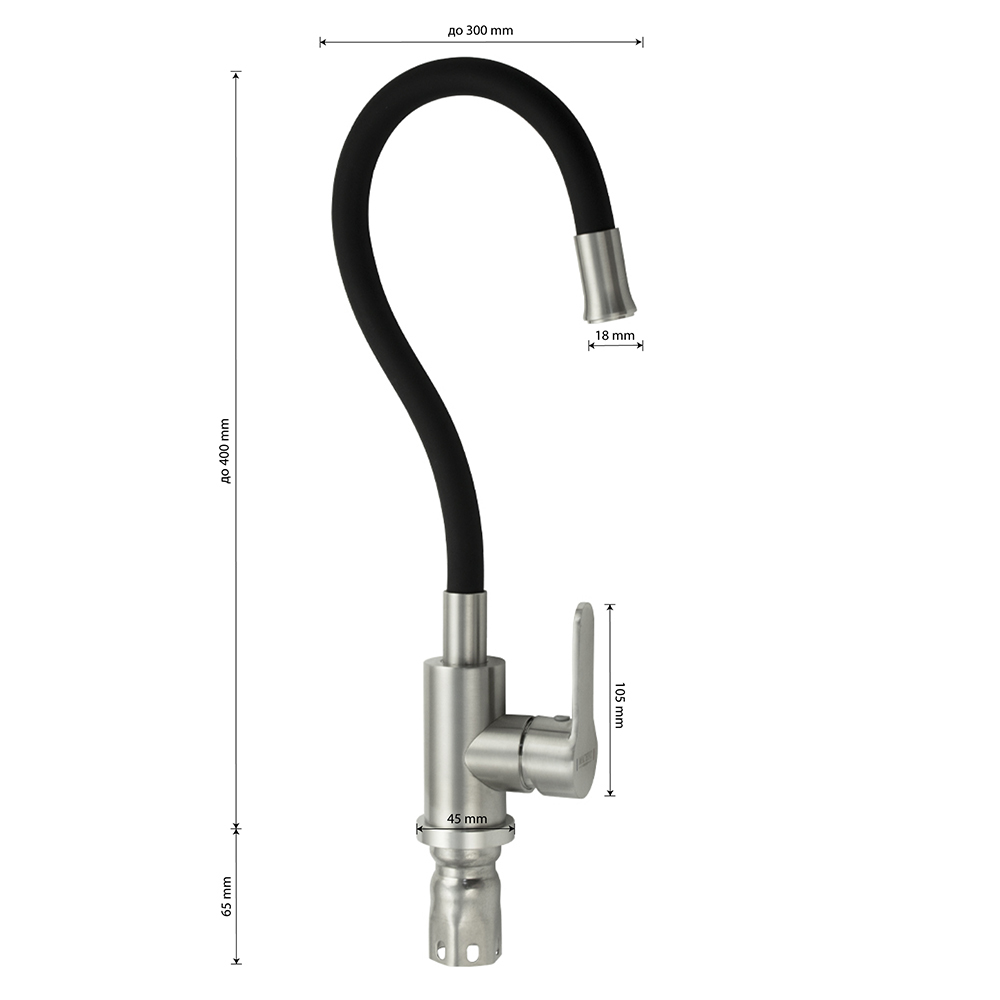 Смеситель для кухонной мойки и раковин, литой матовый корпус, из нержавеющей стали марки 304, с высоким гибким изливом чёрного цвета, с аэратором для экономии воды, шаровый. Крепление резьба - гайка, картридж d = 35 мм, ручка литая. Такая модель может использоваться на домашней кухне, на даче, в медицинских учреждениях и общественных местах. Габаритные размеры: высота до 400 мм, длина до 300 мм, диаметр посадочного седла 45 мм, длина резьбы 65 мм, длина подводки 400 мм. Вес - 2,000 кг, объём - 0,00421 м3. В комплекте паспорт, корпус с изливом, подводка 1/2, крепеж, набор прокладок.