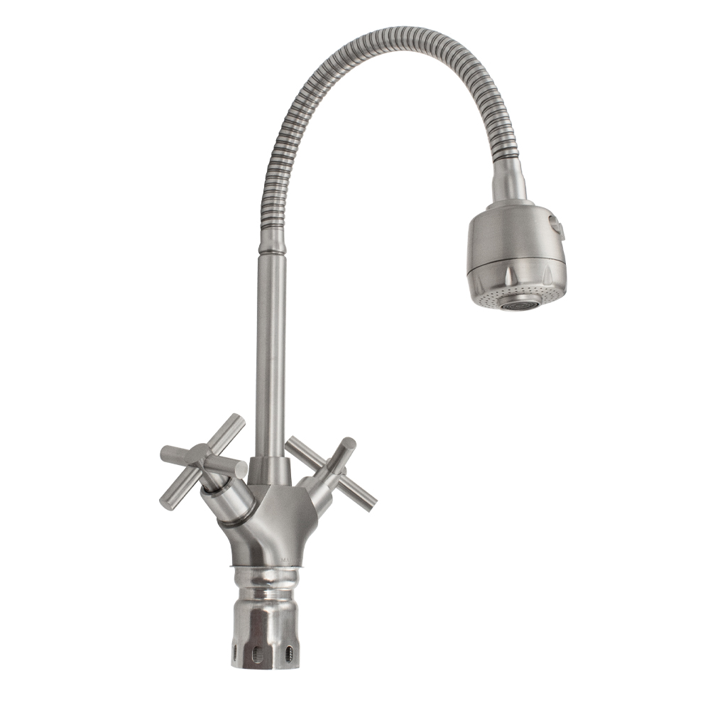 Смеситель для кухонной мойки и раковин, матовый, металлокерамика, из нержавеющей стали марки 304, массивный корпус с гибким изливом, с большим двухрежимным аэратором для экономии воды. Крепление резьба - гайка. Кранбуксы металлокерамика 1/2, ручки крест, поворот на 90˚. Габаритные размеры: высота 300 - 400 мм, длина 250 - 300 мм, диаметр посадочного седла 40 мм, длина резьбы 60 мм, длина подводки 500 мм. Вес - 1,400 кг, объём - 0,00635 м3. В комплекте корпус с изливом, паспорт, подводка 1/2, крепёж.