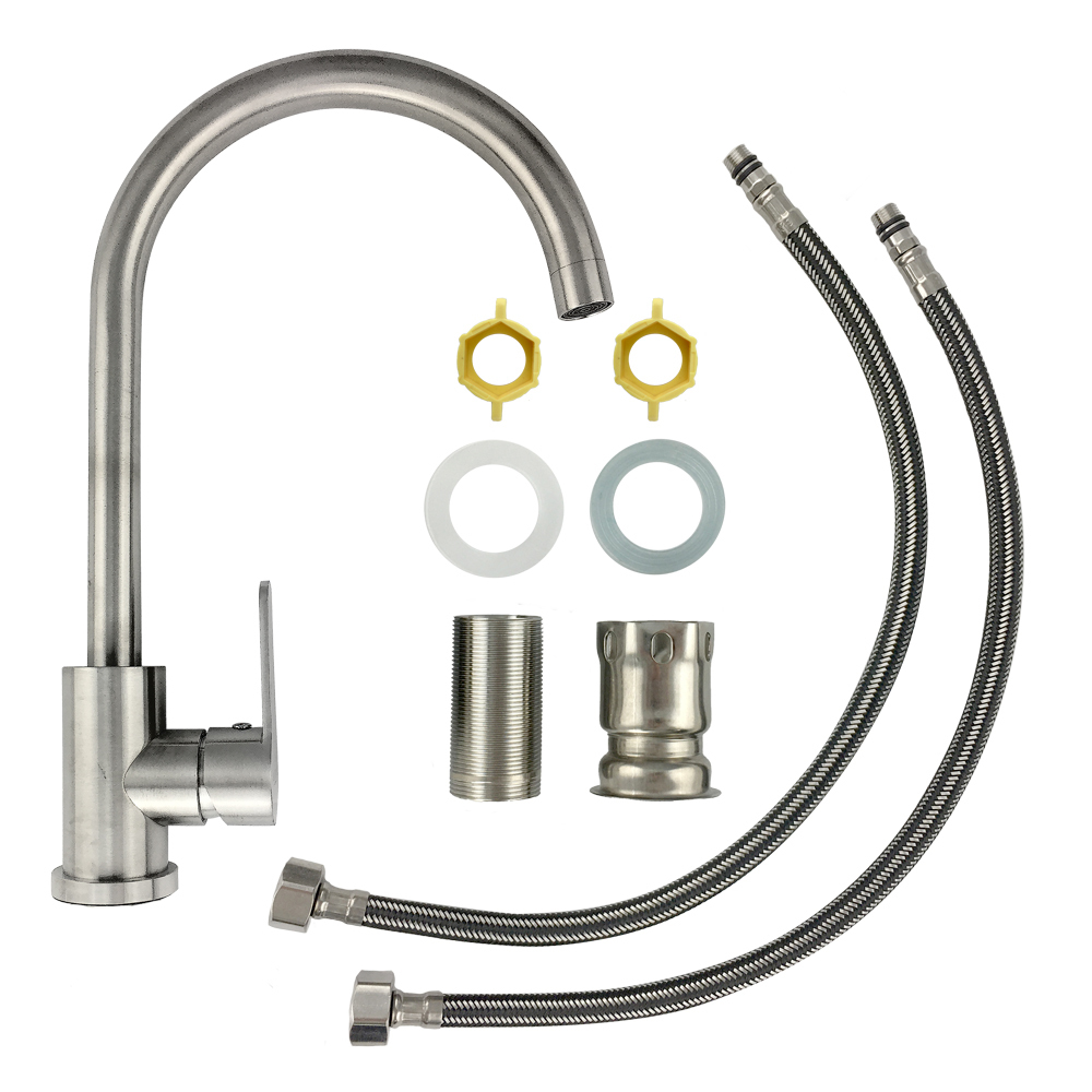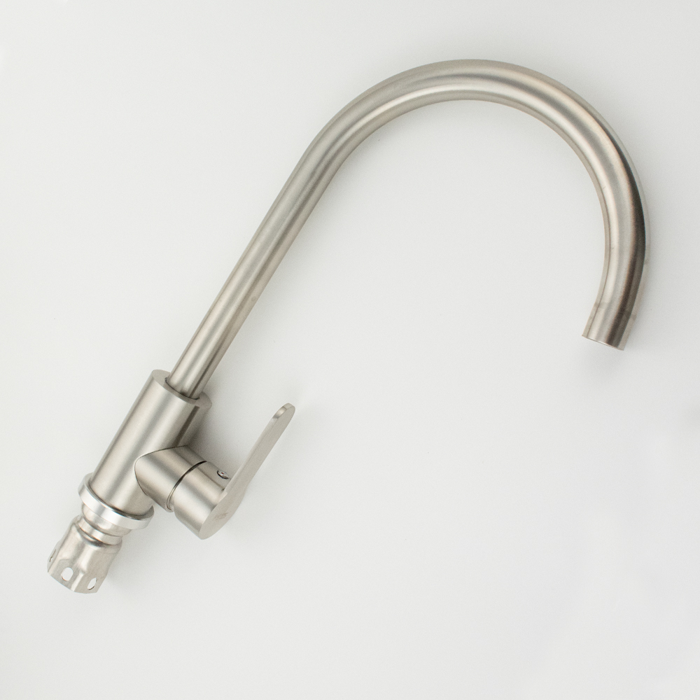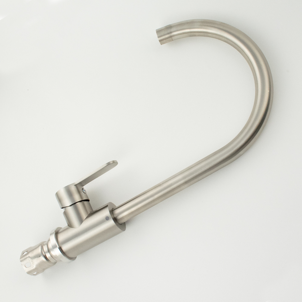 Смеситель для кухонной мойки и раковин, литой матовый корпус, из нержавеющей стали марки 304, с высоким С-образным изливом, шаровый. Крепление резьба - гайка, картридж d = 35 мм, ручка литая. Аэратор для экономии воды. Такая модель может использоваться на домашней кухне, на даче, в медицинских учреждениях и общественных местах. Габаритные размеры: высота 350 мм, длина 210 мм, диаметр посадочного седла 53 мм, длина резьбы 60 мм, длина подводки 500 мм. Вес - 1,500 кг, объём - 0,00635 м3. В комплекте паспорт, корпус с изливом, подводка 1/2, крепеж, набор прокладок.