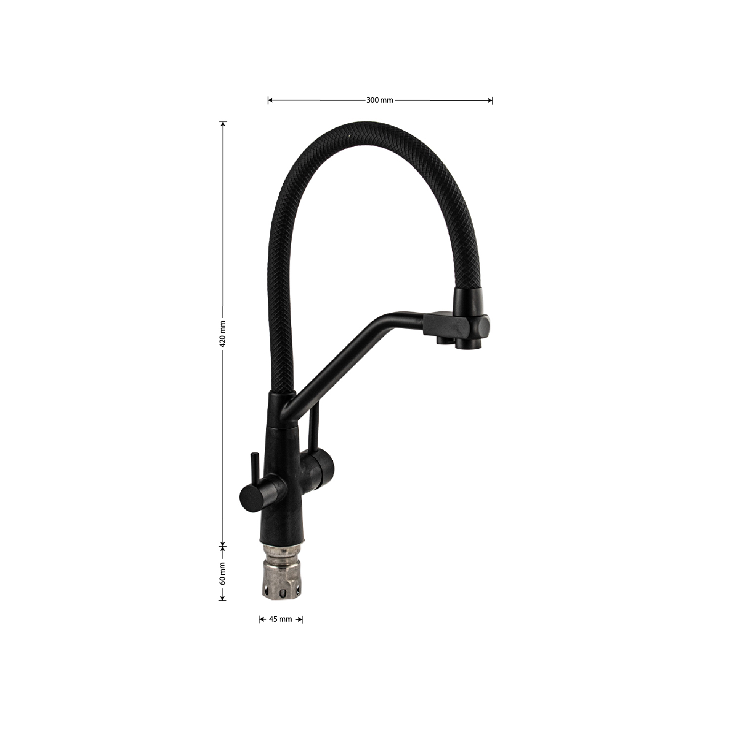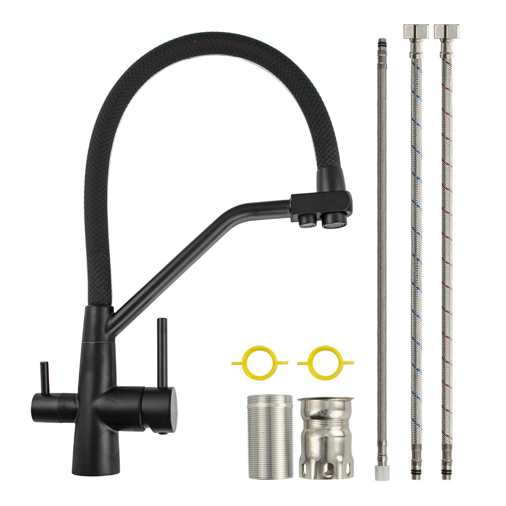 Смеситель для кухонной мойки и раковин с двойным выпуском воды для фильтра, литой чёрный корпус, из нержавеющей стали марка SUS 304, с гибким изливом чёрного цвета с фиксацией на жёстком изливе, шаровый. Крепление резьба - гайка, картридж d = мм, ручка шток. Аэратор для экономии воды. Такая модель может использоваться на домашней кухне, на даче, в медицинских учреждениях и общественных местах. Габаритные размеры: высота 420 мм, длина 300 мм, диаметр посадочного седла 45 мм, длина резьбы 60 мм, длина подводки 500 мм. Вес - 2.3 кг, объём - 0.00746 м3. В комплекте паспорт, корпус с изливом, подводка 1/2, крепеж, набор прокладок.