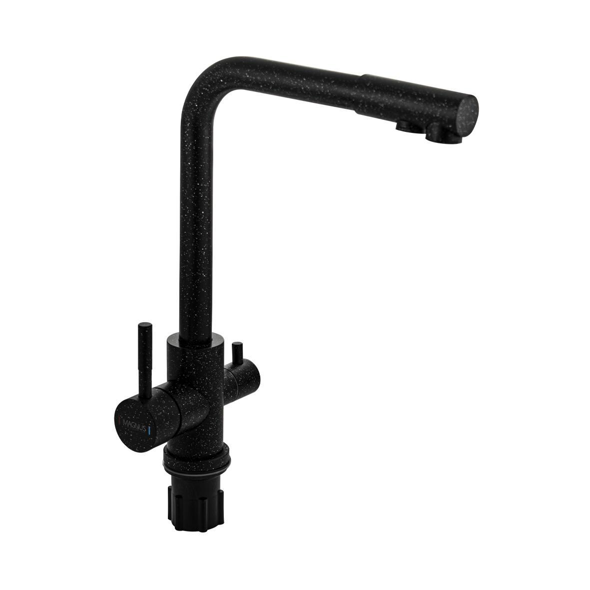 Смеситель для кухонной мойки и раковин, с двойным выпуском воды для фильтра, литой матовый корпус, из нержавеющей стали марки 304 черный, с высоким Г - образным изливом, шаровый. Крепление резьба - гайка, картридж d = 40 мм, ручка шток. Аэратор для экономии воды. Такая модель может использоваться на домашней кухне, на даче, в медицинских учреждениях и общественных местах. Габаритные размеры: высота 300 мм, длина 230 мм, диаметр посадочного седла 40 мм, длина резьбы 45 мм, длина подводки 500 мм. Вес - 1.9 кг, объём - 0.009 м3. В комплекте паспорт, корпус с изливом, подводка 1/2, крепеж, набор прокладок
