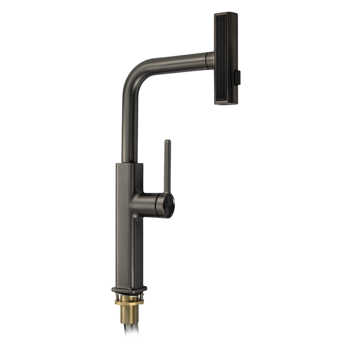 Смеситель для кухонной мойки и раковин, вытяжной излив - лейка с переключением режимов подачи воды, литой корпус под цвет графита, из латуни, шаровый. Крепление резьба - гайка, картридж d = 35 мм, ручка литая. Аэратор для экономии воды. Такая модель может использоваться на домашней кухне, на даче, в медицинских учреждениях и общественных местах. Габаритные размеры: высота 450 мм, длина 220 мм, посадочное седло 50*50 мм, длина резьбы 50 мм. Вес - 2,7 кг, объём - 0,0176 м3. В комплекте паспорт, корпус с изливом, подводка 1/2, крепеж, набор прокладок. Габаритные размеры коробки: длина 690 мм, высота 90 мм, ширина 260 мм.