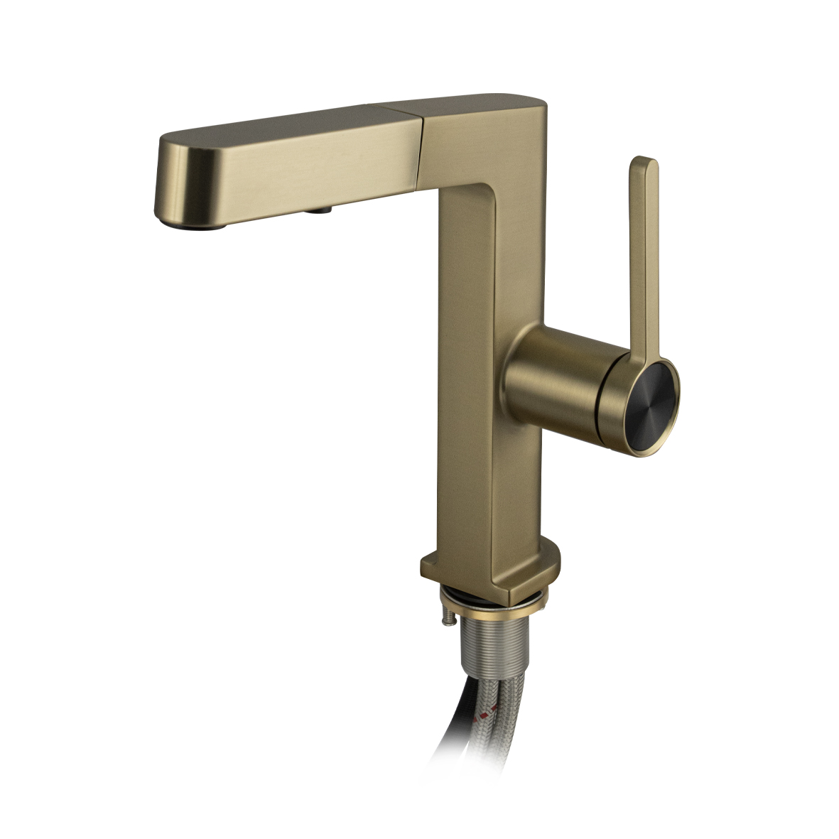 Смеситель для кухонной мойки и раковин, вытяжной излив - лейка с переключением режимов подачи воды, литой корпус под цвет матового золота, из латуни, шаровый. Крепление резьба - гайка, картридж d = 35 мм, ручка литая. Аэратор для экономии воды. Такая модель может использоваться на домашней кухне, на даче, в медицинских учреждениях и общественных местах. Габаритные размеры: высота 220 мм, длина 230 мм, посадочное седло 50*50 мм. Вес - 2,45 кг, объём - 0,01633 м3. В комплекте паспорт, корпус с изливом, подводка 1/2, крепеж, набор прокладок.