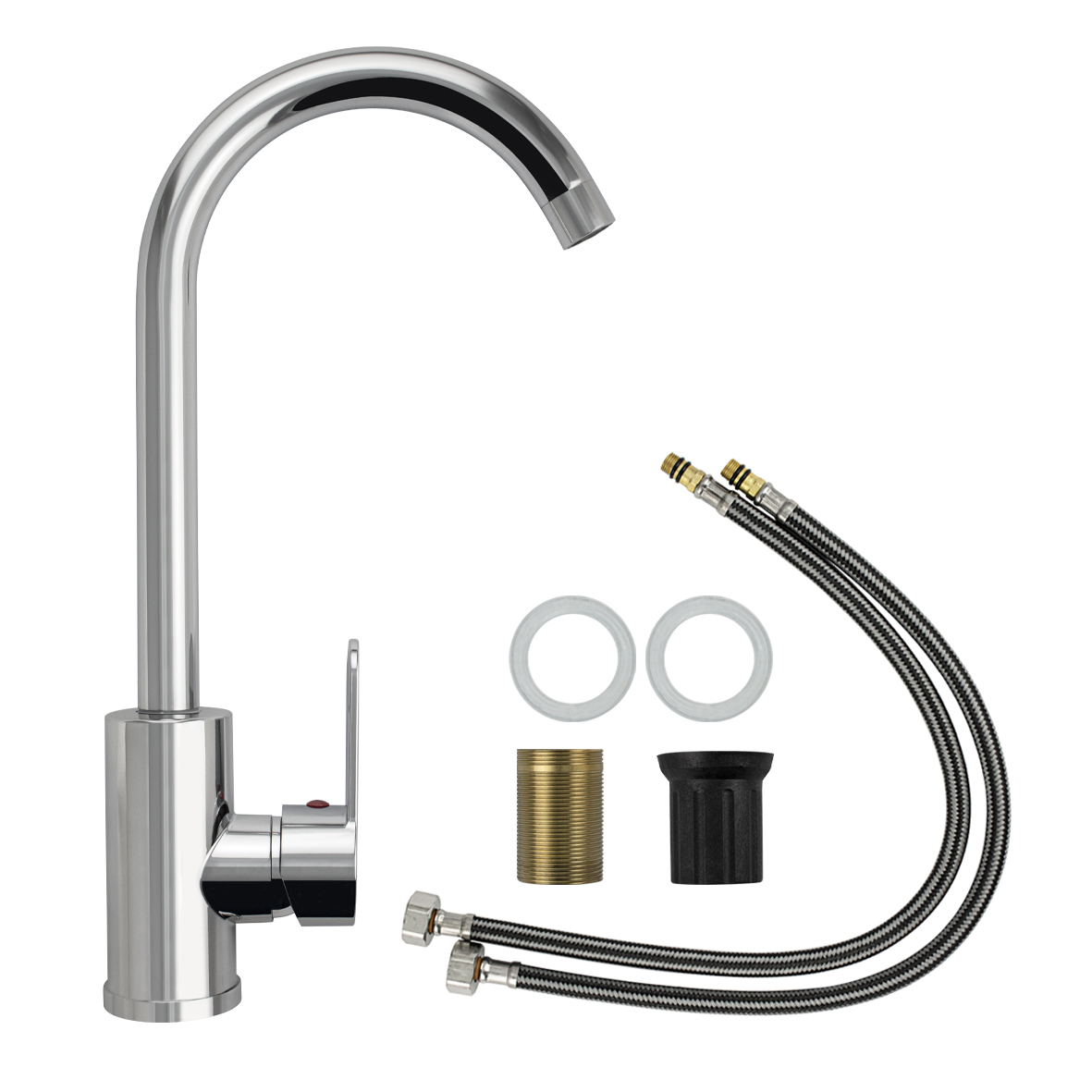 Смеситель для кухонной мойки и раковин, из высокопрочного пластика АБС, с алюминиевым основанием, ХРОМИРОВАННЫЙ, боковой, с высоким С-образным изливом, шаровый. Крепление резьба - гайка, картридж d = мм, литая ручка. Хромированный аэратор для экономии воды. Габаритные размеры: высота 370 мм, длина 200 мм, диаметр посадочного седла 50 мм, длина резьбы 50 мм, длина подводки 500 мм. Вес - 0.90 кг, объём - 0,00516 м3. В комплекте паспорт, корпус с изливом, пластиковая подводка с латунными штуцерами 1/2, крепеж, набор прокладок.