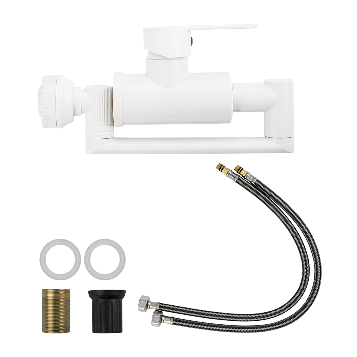 Смеситель для кухонной мойки и раковины, белый, с поворотным изливом и аэратором, шаровый. Из высокопрочного пластика АБС. Крепление резьба - гайка, картридж d = 40 мм. Аэратор для экономии воды. Габаритные размеры: высота 340 мм, длина 210 мм, диаметр посадочного седла 50 мм, длина резьбы 50 мм, длина подводки 500 мм. Вес - 0,84 кг, объём - 0,003 м3. В комплекте паспорт, корпус, подводка 1/2, крепеж, набор прокладок.