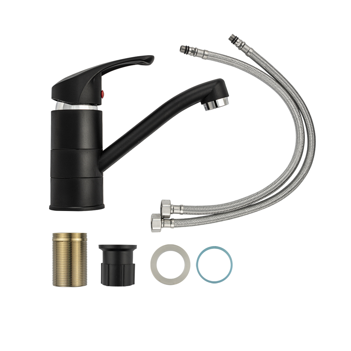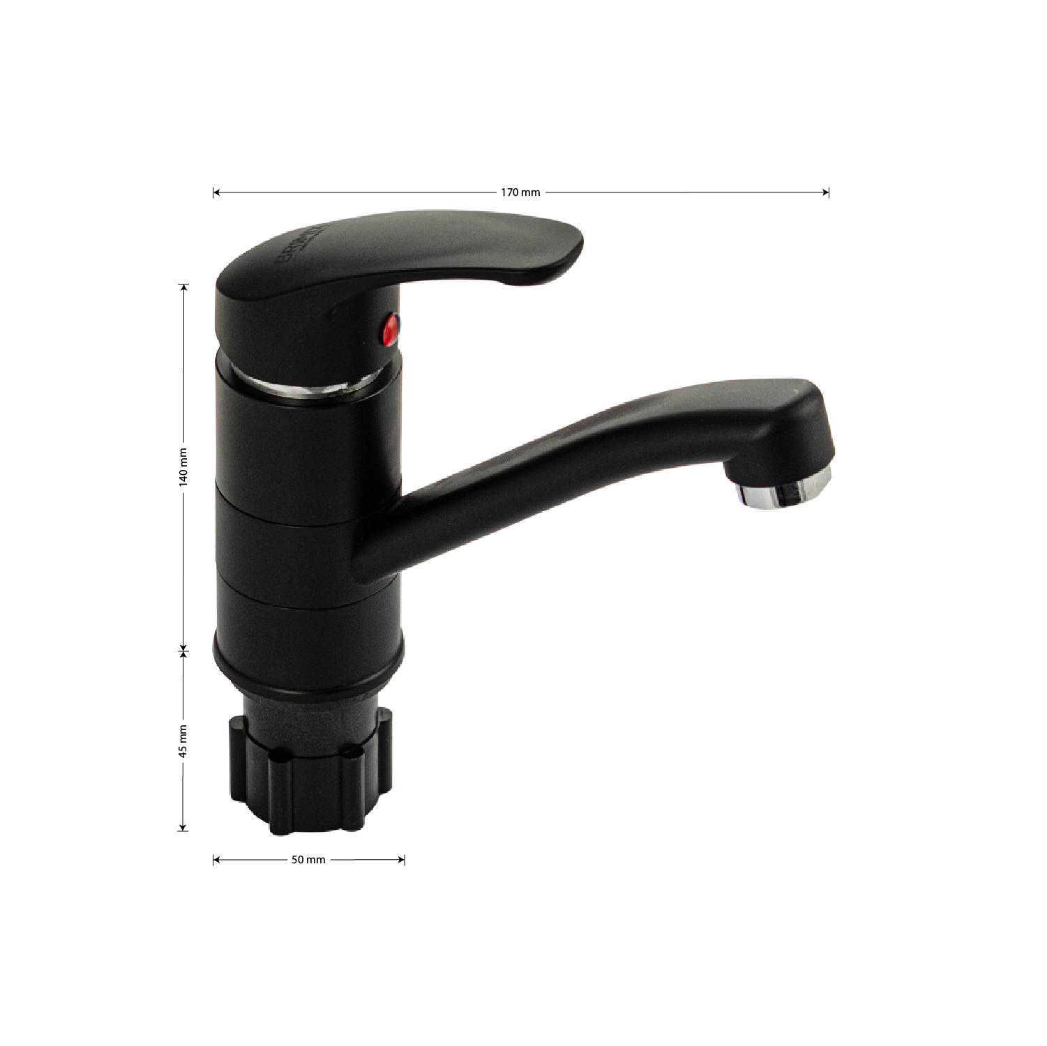 Смеситель для раковины, кухонной мойки, из высокопрочного пластика АБС, черный с коротким изливом 15 см, литой корпус, литая ручка, шаровый. Крепление резьба - гайка, картридж d = 40 мм. хромированный, аэратор для экономии воды. Габаритные размеры: высота 140 мм, длина 170 мм, диаметр посадочного седла 50 мм, длина резьбы 45 мм, длина подводки 450 мм. Вес - 0,57 кг, объём - 0,00183 м3. В комплекте паспорт, корпус, пластиковая подводка с латунными штуцерами 1/2, крепеж, набор прокладок.