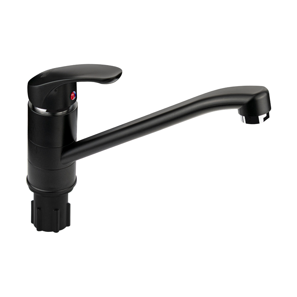 Смеситель для кухонной мойки и раковины, черный, с длинным, поворотным изливом, шаровый.Из высокопрочного пластика АБС. Крепление резьба - гайка, картридж d = 40 мм. Аэратор для экономии воды. Габаритные размеры: высота 180 мм, длина 250 мм, диаметр посадочного седла 50 мм, длина резьбы 45 мм, длина подводки 450 мм. Вес - 0.59 кг, объём - 0.00282 м3. В комплекте паспорт, корпус, подводка 1/2, крепеж, набор прокладок.