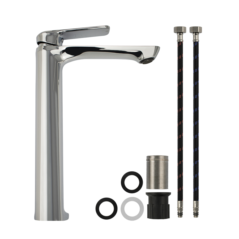 Смеситель для раковины, литой высокий круглый корпус, цвет хром, с прямым плоским изливом, ручка литая прямая, шаровый. Крепление резьба - гайка, картридж d = 35 мм. Аэратор для экономии воды. Такая модель может использоваться на домашней кухне, на даче, в медицинских учреждениях и общественных местах. Габаритные размеры: высота 310 мм, длина 200 мм, посадочное седло 50 мм, длина резьбы 45 мм, длина подводки 450 мм. Вес - 1,6 кг, объём - 0,00462 м3. В комплекте паспорт, корпус, подводка 1/2, крепеж, набор прокладок.