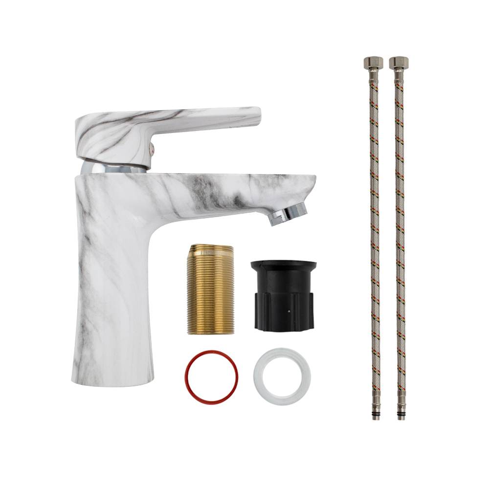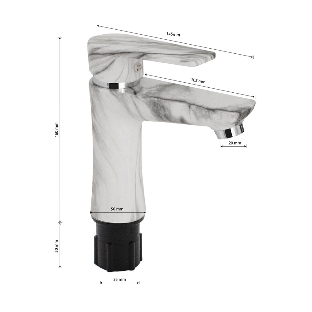 Смеситель для раковины, из высокопрочного пластика АБС, БЕЛЫЙ МРАМОР, с коротким изливом, литой корпус, литая ручка, шаровый. Крепление резьба - гайка, картридж d = 40 мм, хромированный, аэратор для экономии воды. Габаритные размеры: высота 160 мм, длина 145 мм, длина излива 105 мм, диаметр посадочного седла 50 мм, длина резьбы 50 мм, длина подводки 400 мм. Вес - 0,650 кг, объём - 0,00417 м3. В комплекте паспорт, корпус, пластиковая подводка с латунными штуцерами 1/2, крепеж, набор прокладок.