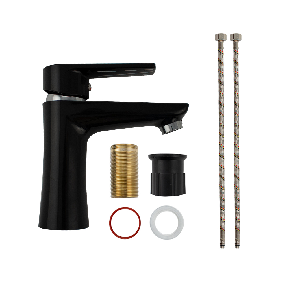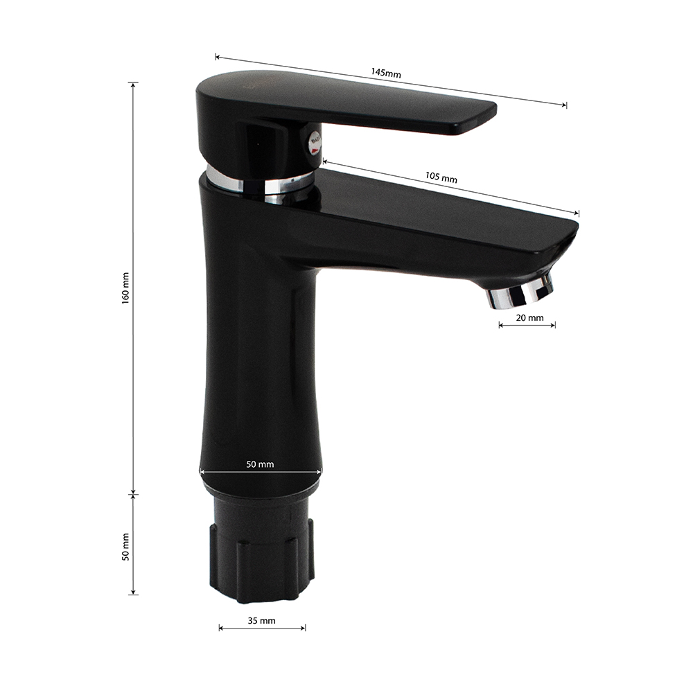 Смеситель для раковины, из высокопрочного пластика АБС, ЧЁРНЫЙ с коротким изливом, литой корпус, литая ручка, шаровый. Крепление резьба - гайка, картридж d = 40 мм. хромированный аэратор для экономии воды. Габаритные размеры: высота 160 мм, длина 145 мм, длина излива 105 мм, диаметр посадочного седла 50 мм, длина резьбы 50 мм, длина подводки 400 мм. Вес - 0,650 кг, объём - 0,00417 м3. В комплекте паспорт, корпус, пластиковая подводка с латунными штуцерами 1/2, крепеж, набор прокладок.