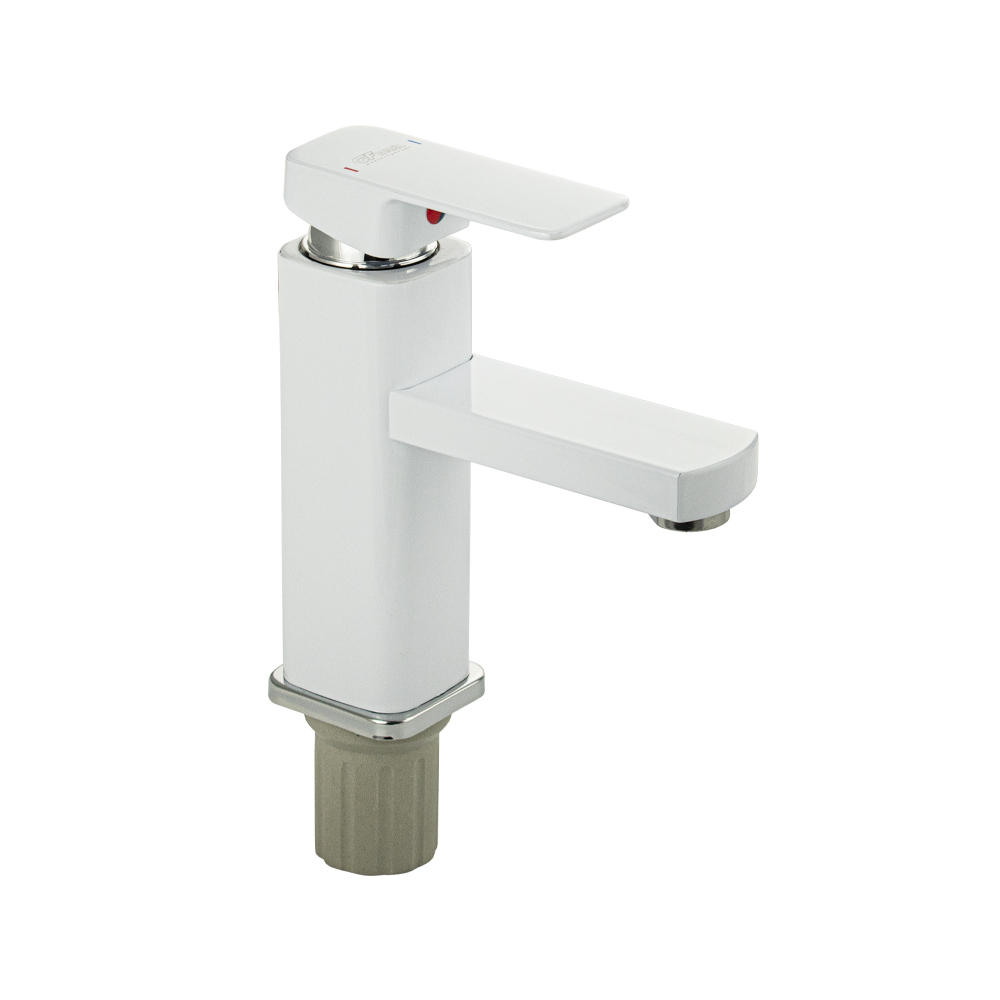 Смеситель для раковины, модель элегант, из высокопрочного пластика АБС, БЕЛЫЙ с коротким изливом, литой квадратный корпус, литая ручка, шаровый. Крепление резьба - гайка, картридж d = 40 мм. хромированный аэратор для экономии воды. Габаритные размеры: высота 170 мм, длина 155 мм, посадочное седло 55*55 мм, длина резьбы 60 мм, длина подводки 450 мм. Вес - 1.01 кг, объём - 0.00273 м3. В комплекте паспорт, корпус, пластиковая подводка с латунными штуцерами 1/2, крепеж, набор прокладок.
