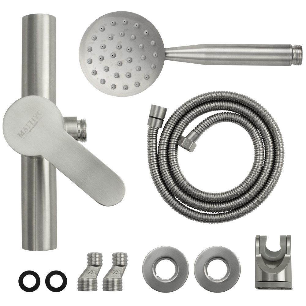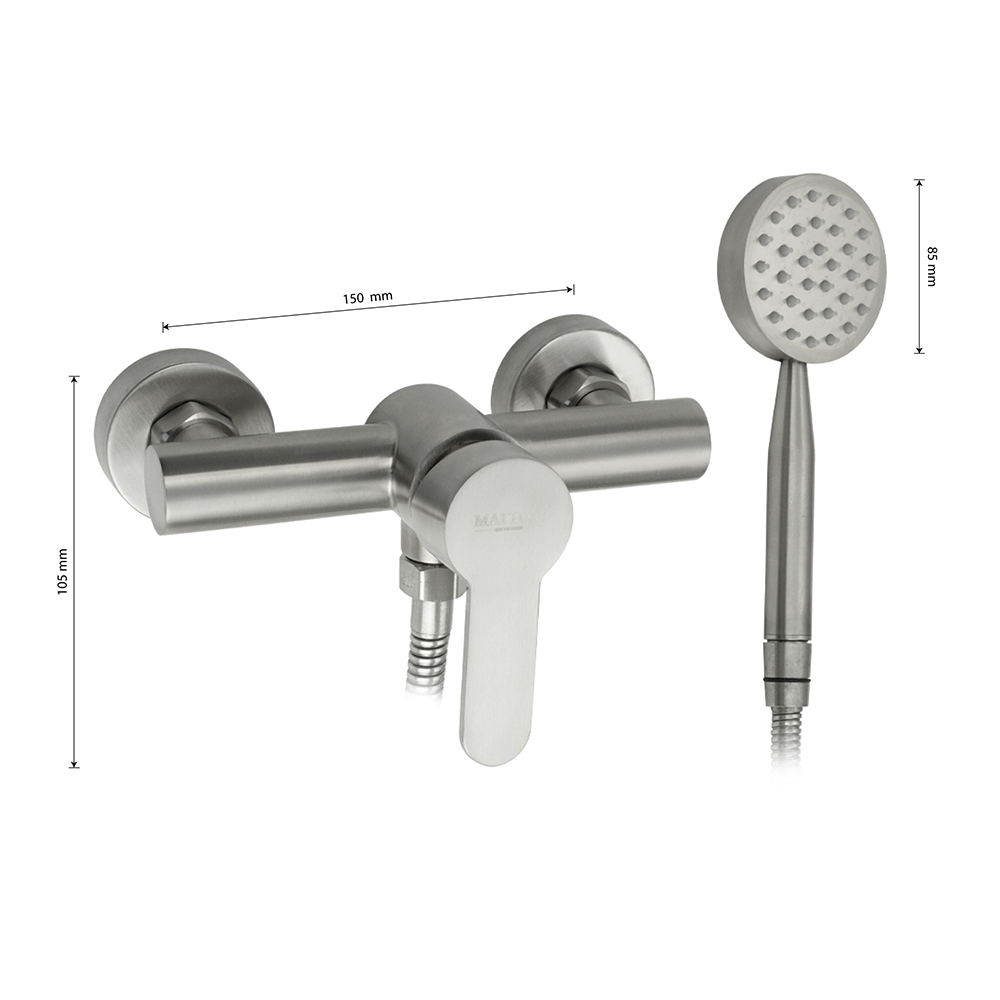 Смеситель матовый из нержавеющей стали марки 304, в ванную / душевую комнату / кабинку, без излива, литой корпус, шаровый. Картридж d = 40 мм, литая ручка, чашки и эксцентрики. Габаритные размеры: ширина 150 мм, высота корпуса 105 мм, душевая лейка d = 85 мм, шланг 150 см. Вес - 1,500 кг, объём - 0,00730 м3. В комплекте паспорт, корпус, душевая лейка, шланг, кронштейн, комплект крепежа и прокладок.