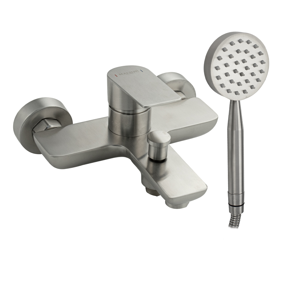 Смеситель матовый, из нержавеющей стали марки 304 в ванную / душевую комнату, с коротким литым изливом. Картридж d = 40 мм, ручка литая. Дутый, большой корпус с дивертором м/к на корпусе, аэратор для экономии воды, чашки, гайки и эксцентрики из нержавеющей стали. Габаритные размеры: ширина 150 мм, высота 100 мм, длина излива 155 мм, диаметр чашки 60 мм, длина шланга 150 см, лейка d = 85 мм. Вес - 2,200 кг, объём - 0,00800 м3. В комплекте корпус с изливом, дивертор, кронштейн, паспорт, крепёж, прокладки, лейка, шланг.