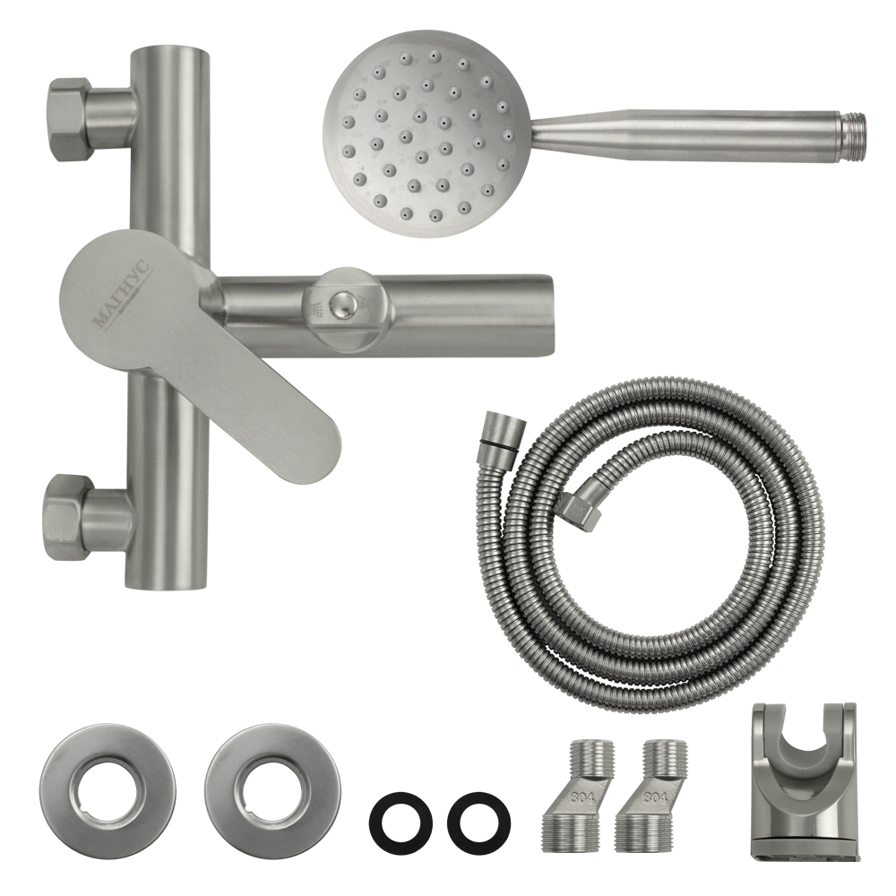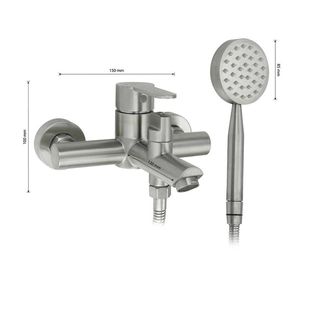 Смеситель матовый, из нержавеющей стали марки 304 в ванную / душевую комнату, с коротким литым изливом. Картридж d = 35 мм, ручка литая. Дутый, большой корпус с дивертором м/к на корпусе, аэратор для экономии воды, чашки, гайки и эксцентрики из нержавеющей стали. Габаритные размеры: ширина 150 мм, высота 100 мм, длина излива 120 мм, диаметр чашки 60 мм, длина шланга 150 см, лейка d = 85 мм. Вес - 2,00 кг, объём - 0,00680 м3. В комплекте корпус с изливом, дивертор, кронштейн, паспорт, крепёж, прокладки, лейка, шланг.